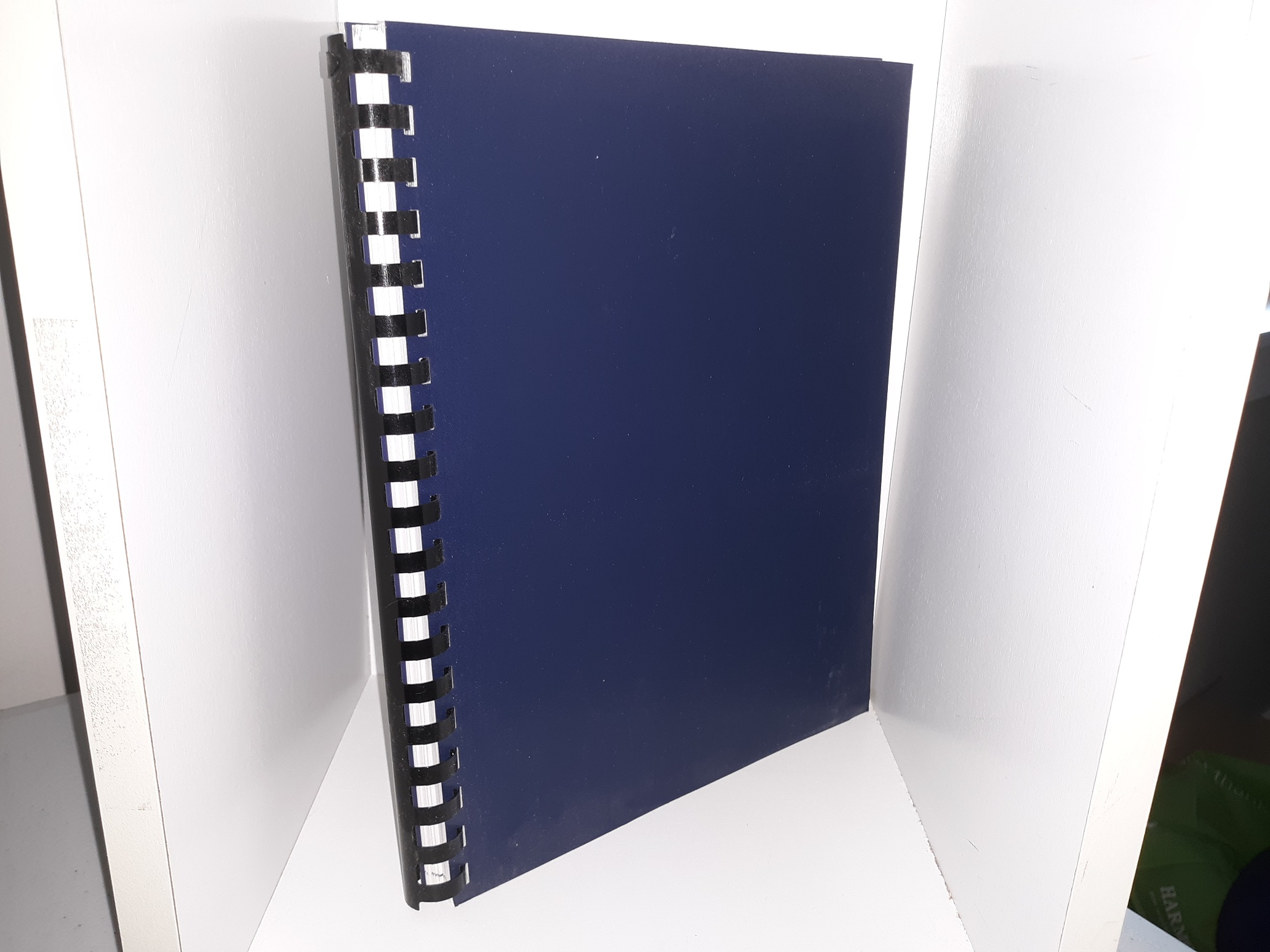 Very good condition, large, blue softcover with a black comb binding. The cover has some adhesive residue, and slightly creased corners. The title page has writing in pen, and pencil. Text and illustrations throughout are clean, clear, and legible.