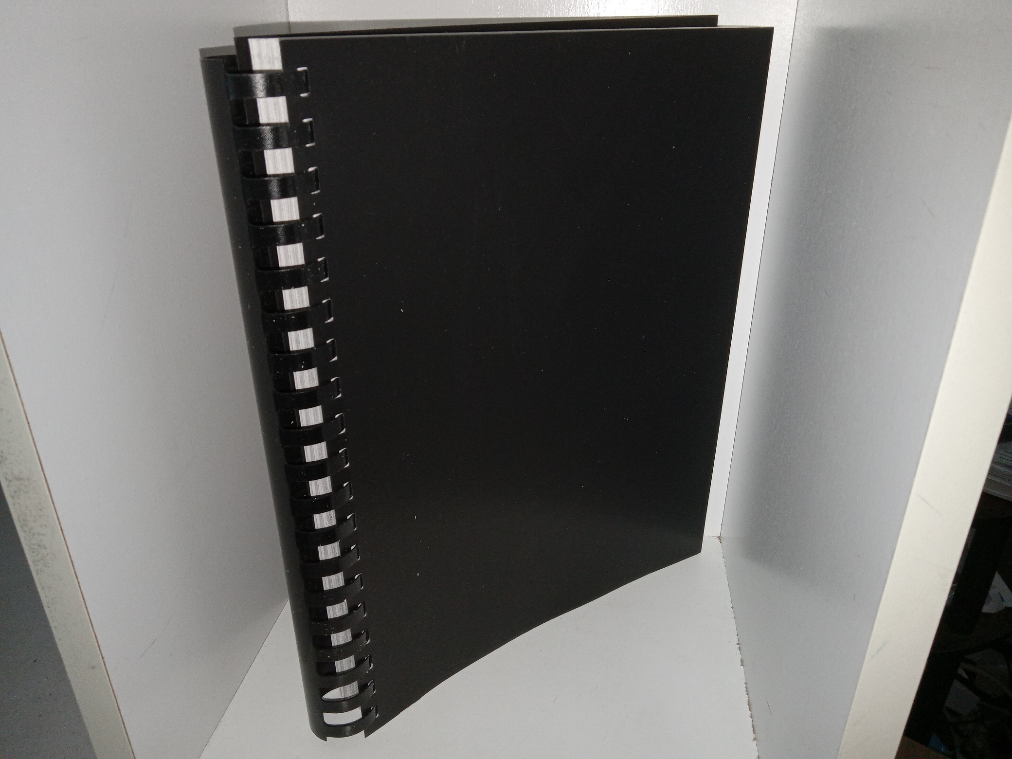 Good condition, large, black softcover with no title printed on the covers, and with a black comb binding. The covers have some scuff marks and residue. the first page has writing in pencil, and eraser marks. Text throughout is clean, clear, and legible.