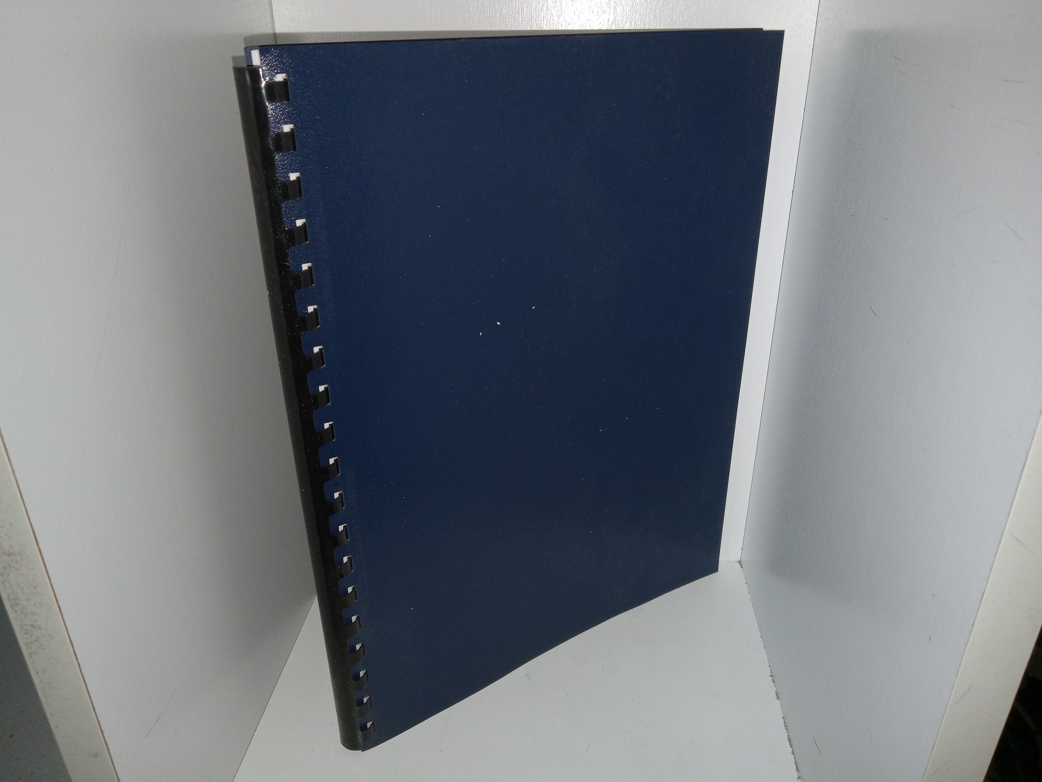 Good condition, large, dark blue softcover with no title printed on the covers, and with a black comb binding. The covers have some scuff marks and some residue. The first page has writing in pencil, and eraser marks. Text throughout is clean, clear, and legible.