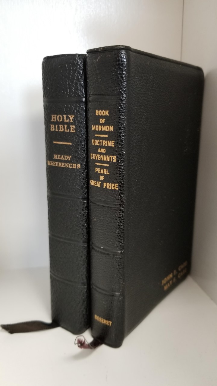 Small size triple combination dated 1958 (on all three title pages). Also a Holy Bible. Both have gold leafed page edges; they are quite nice. Both also have two names engraved on the front covers.