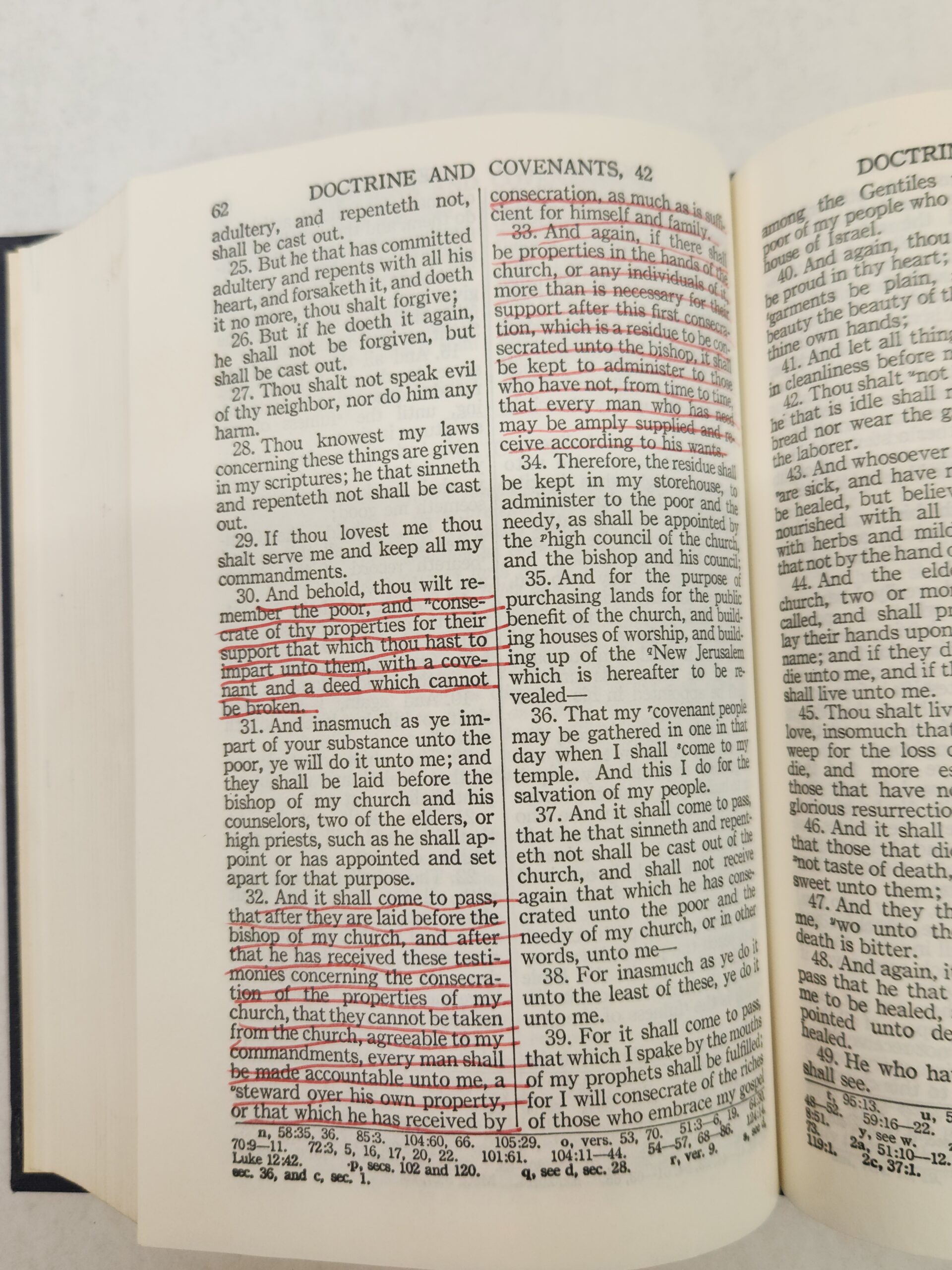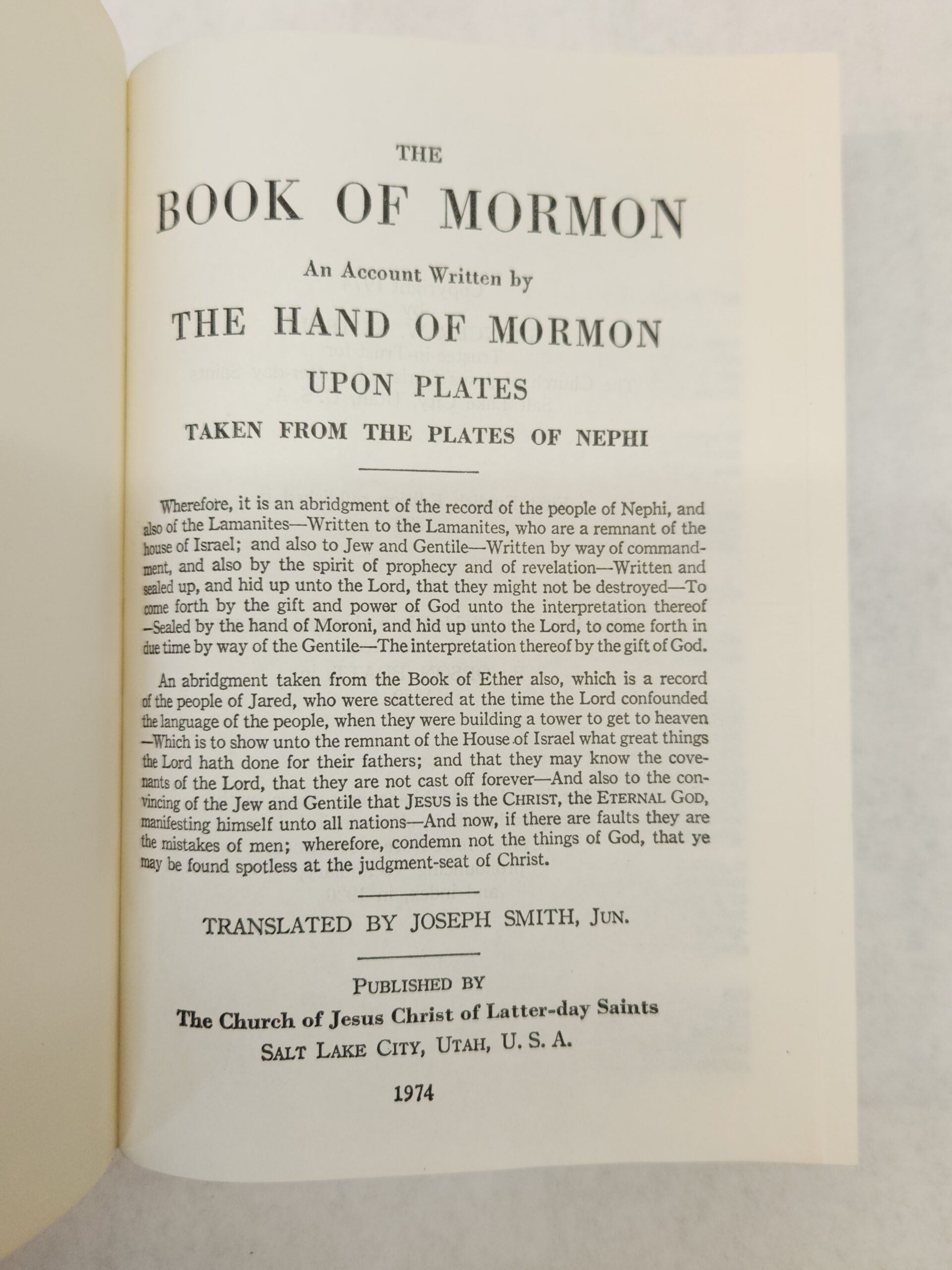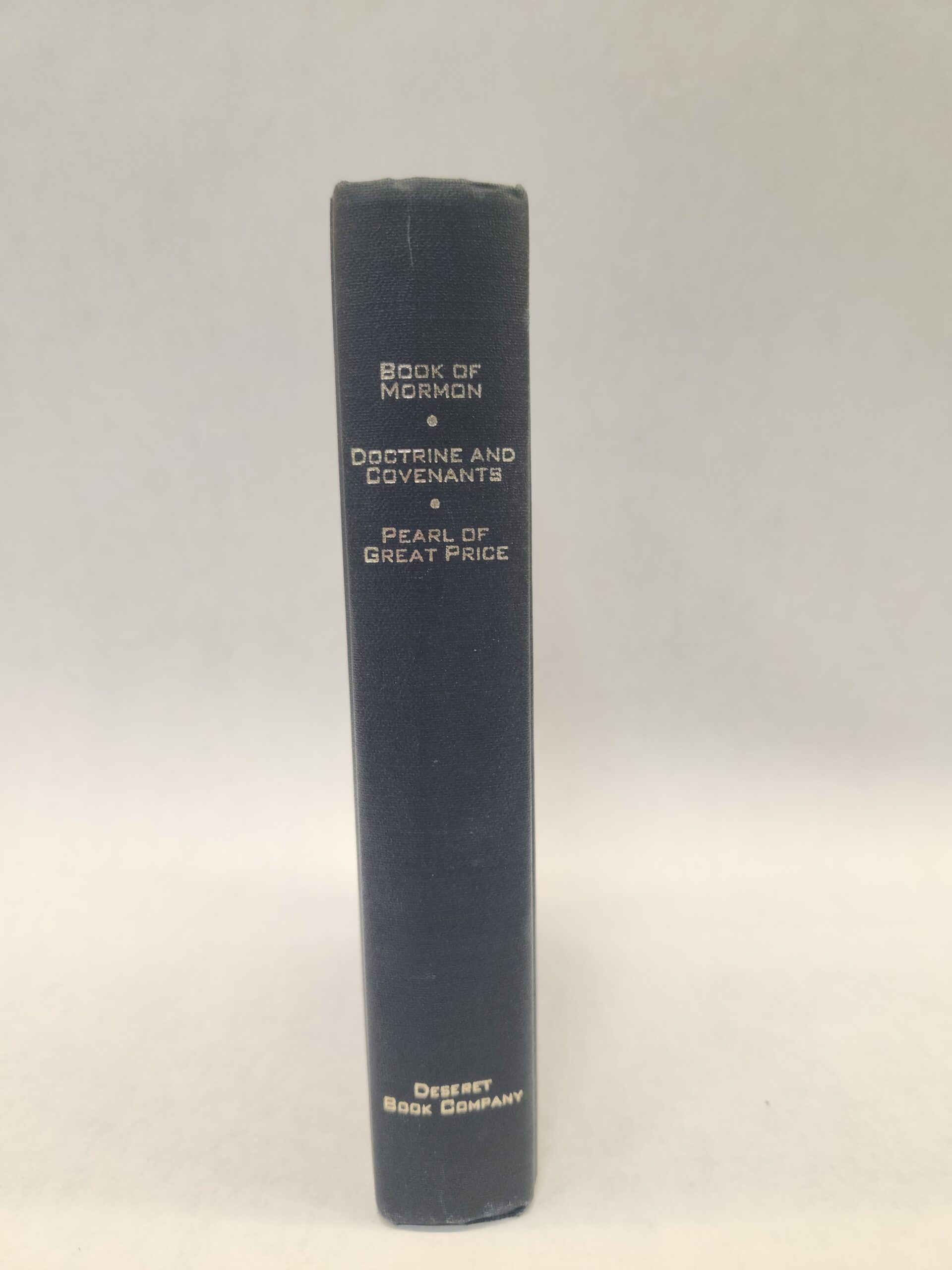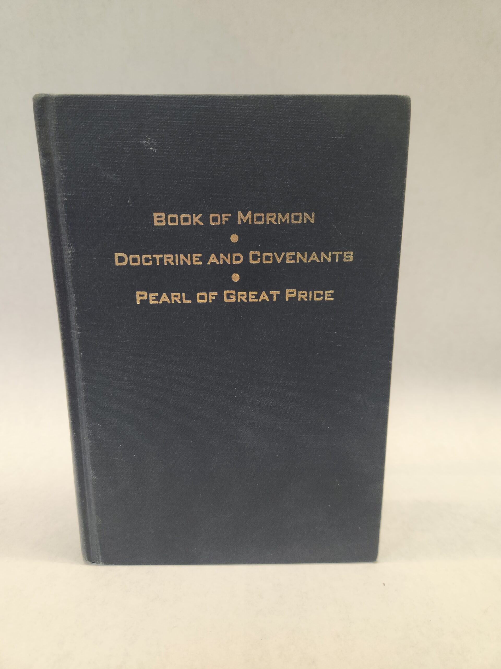 Book of Mormon:: Doctrine and Covenants:: Pearl of Great Price (1974, Triple Combination, Hardcover) There are a few underlining throughout the books and a name on the inside of front cover (see pic for example). Binding is good. Corners and edges show some shelf wear. Cover, front and back, and spine have some smudge/scratches/dings.