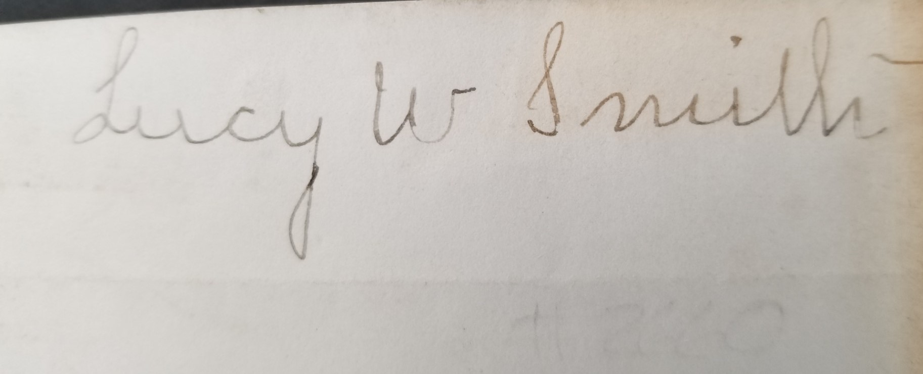 There is a 3×5 card inside the book that states: “This book was obtained from the Smith family and is signed by Lucy W. Smith, wife of President George Albert Smith.”
