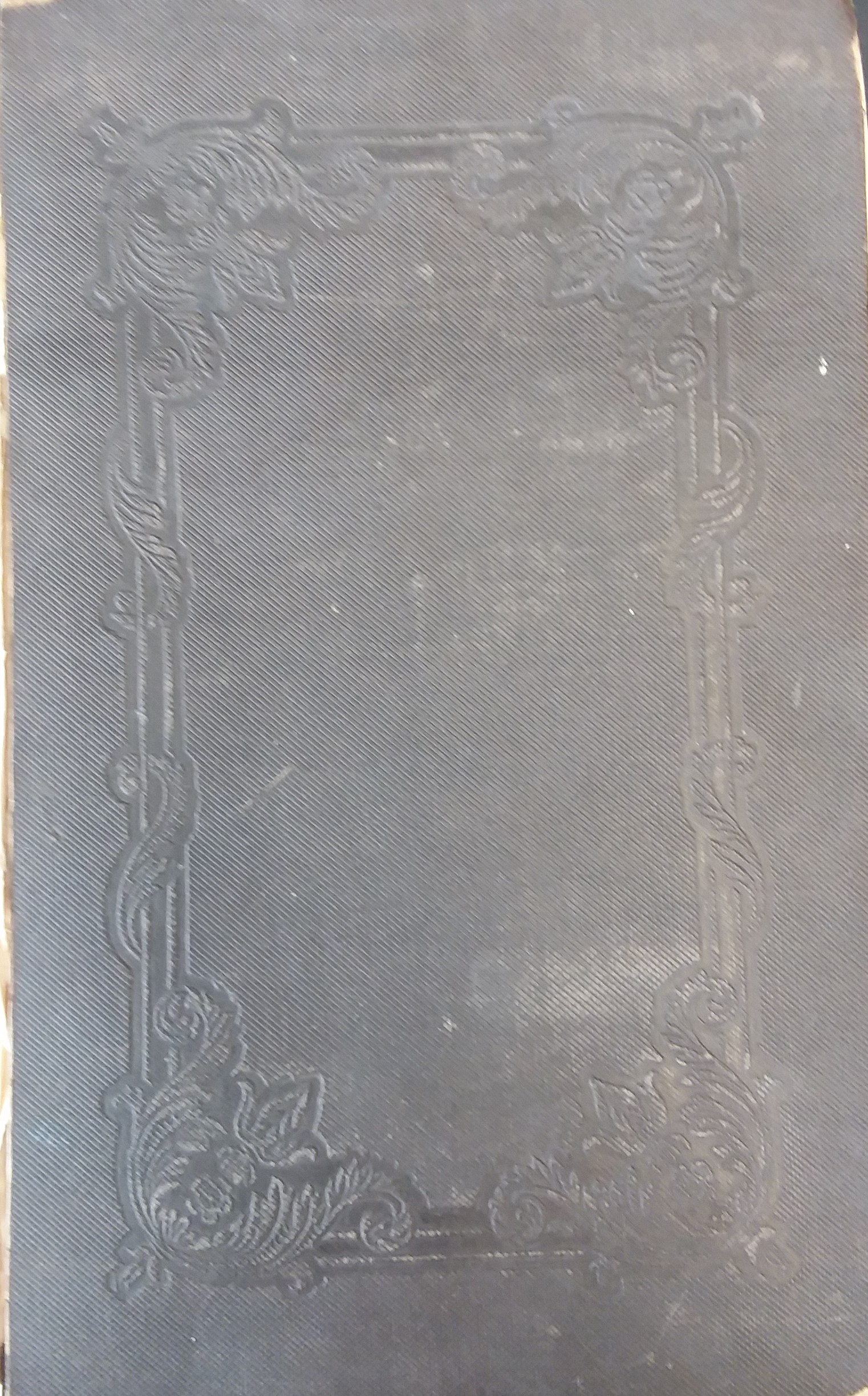 Black hardcover with major shelf wear. The spine is missing from the text block and the front and back cover have both completely torn away but are still included. Large scuffs and smudges on both covers. Pencil markings on the first page, but otherwise the text throughout is clean, clear, and legible.