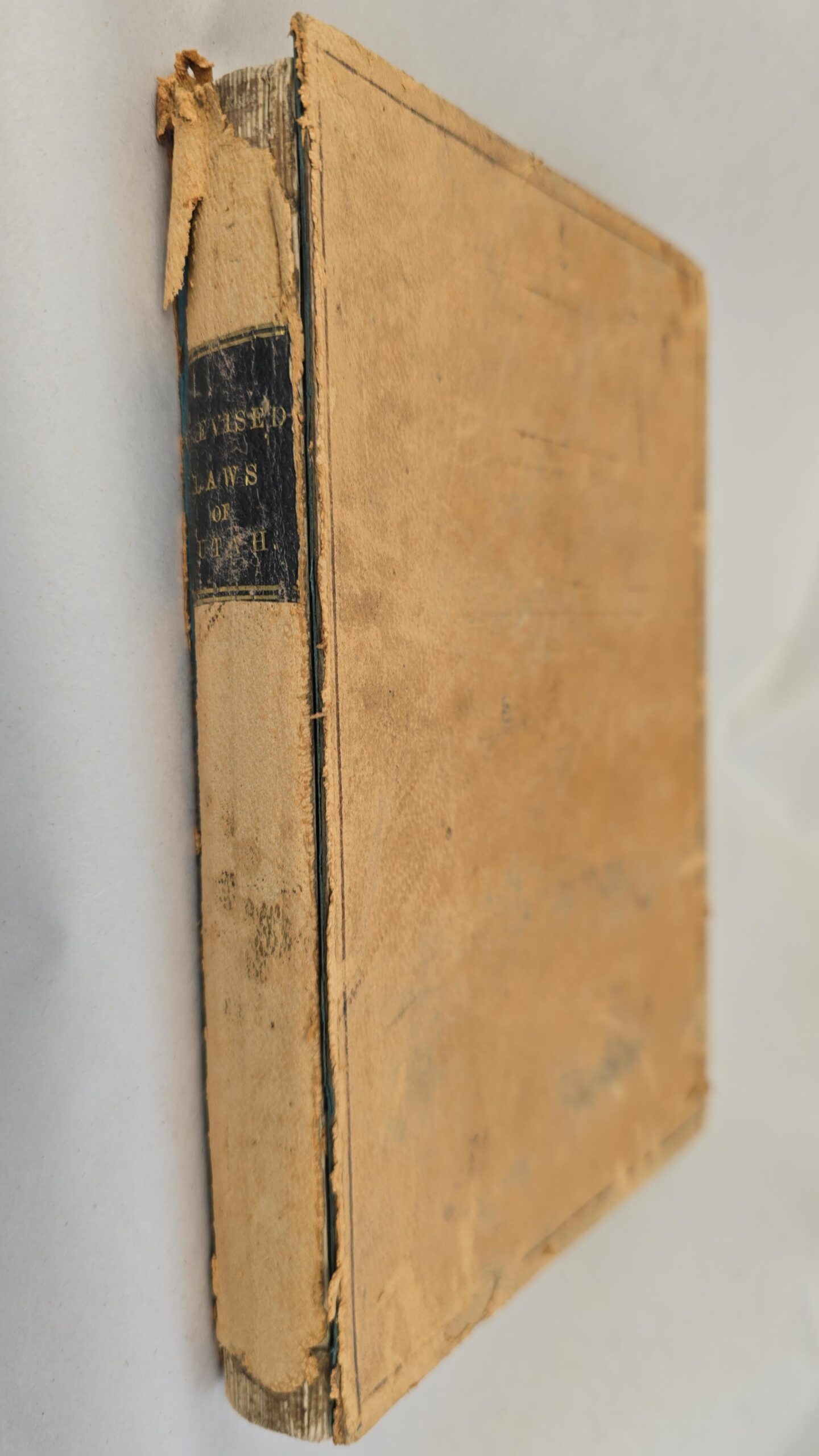 Bound in suede leather; with both book boards detached, but with the title on the spine “Revised Laws of Utah.”