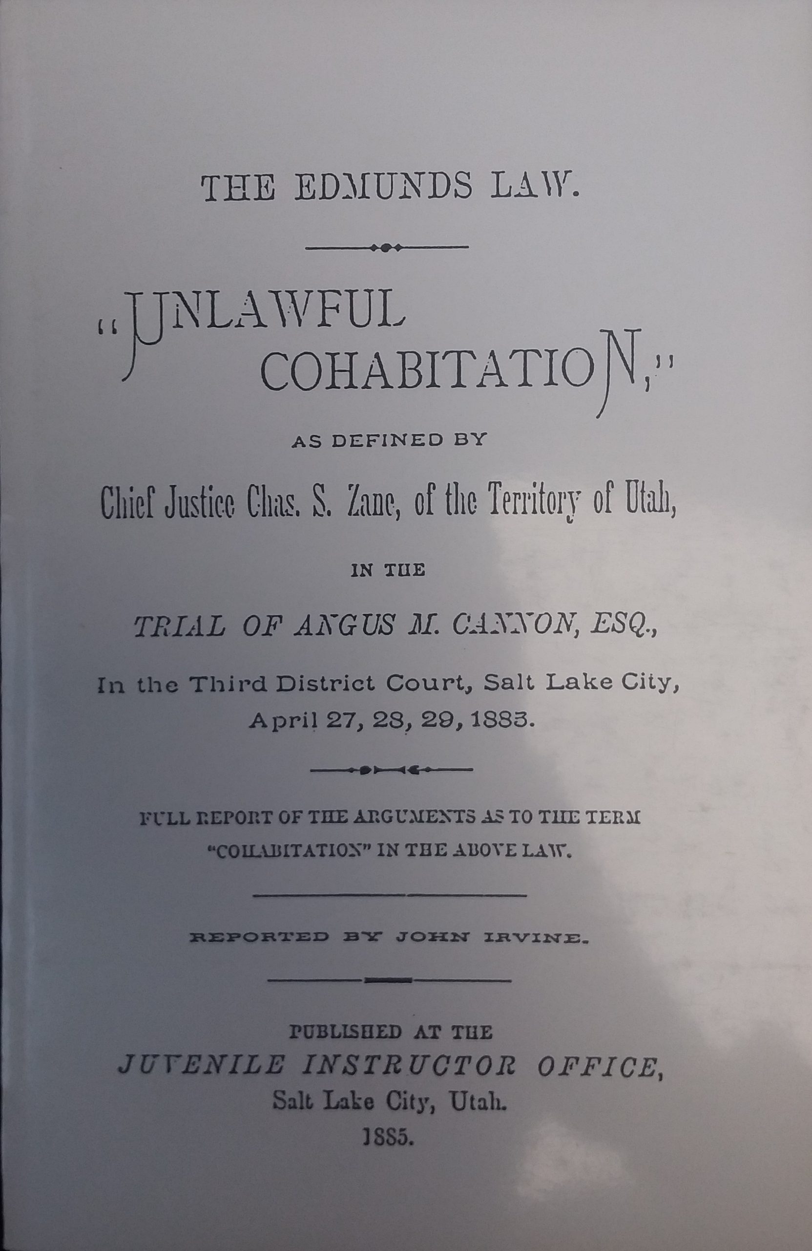 The Edmunds Law “Unlawful Cohabitation,” As Defined By Chief Justice Chas. S. Zane, of the Territory of Utah, in the Trail of Angus M. Cannon, ESQ., In the Third District Court, Salt Lake City, April 1883 (REPRINT)