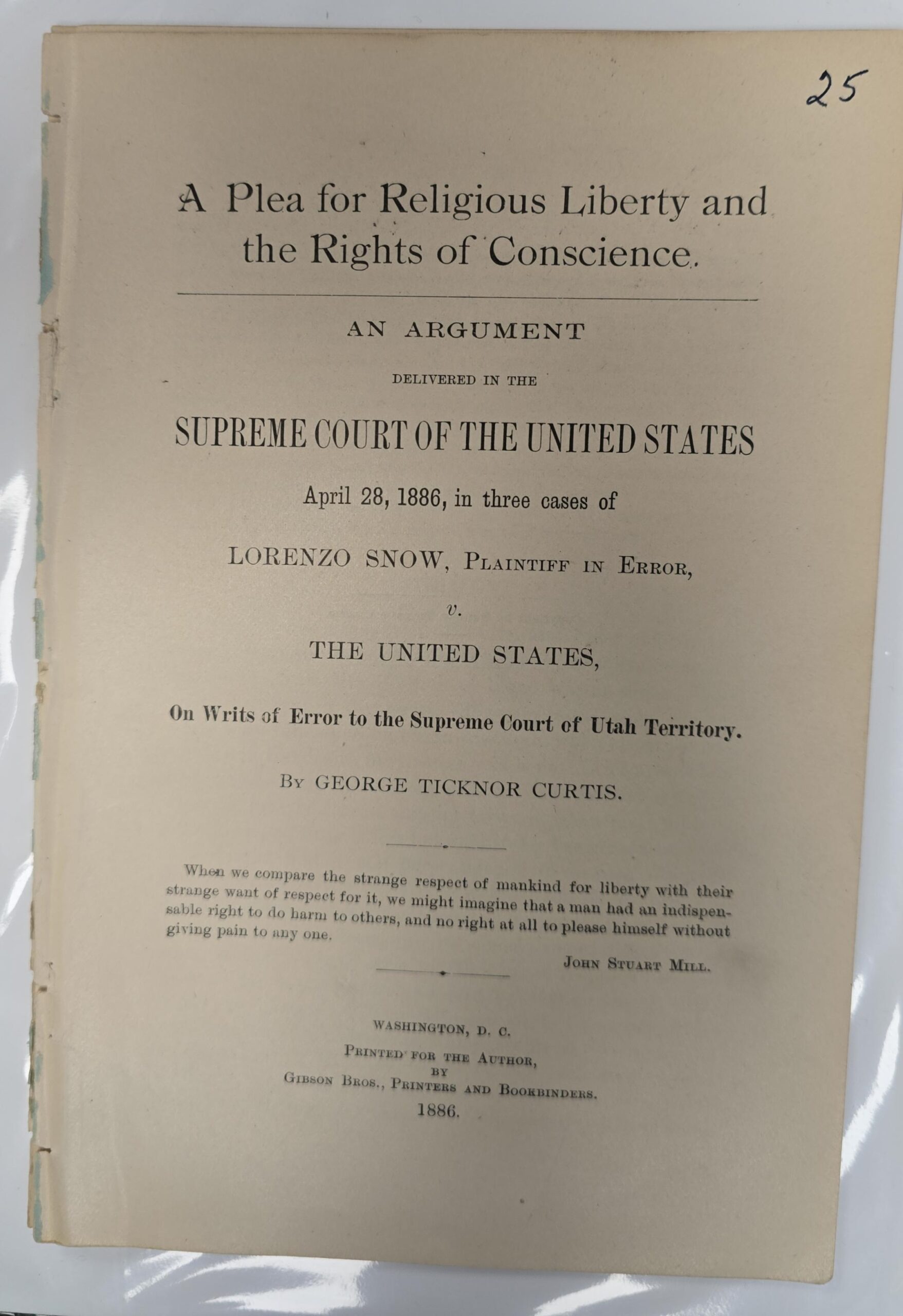 Curtis, George Ticknor. A Plea for Religious Liberty and the Rights of Conscience: An Argument Delivered in the Supreme Court of the United States, On Writs of Error to the Supreme Court of Utah Territory. Gibson Bros., Printers and Bookbinders: Washington D. C., 1886. 42p.