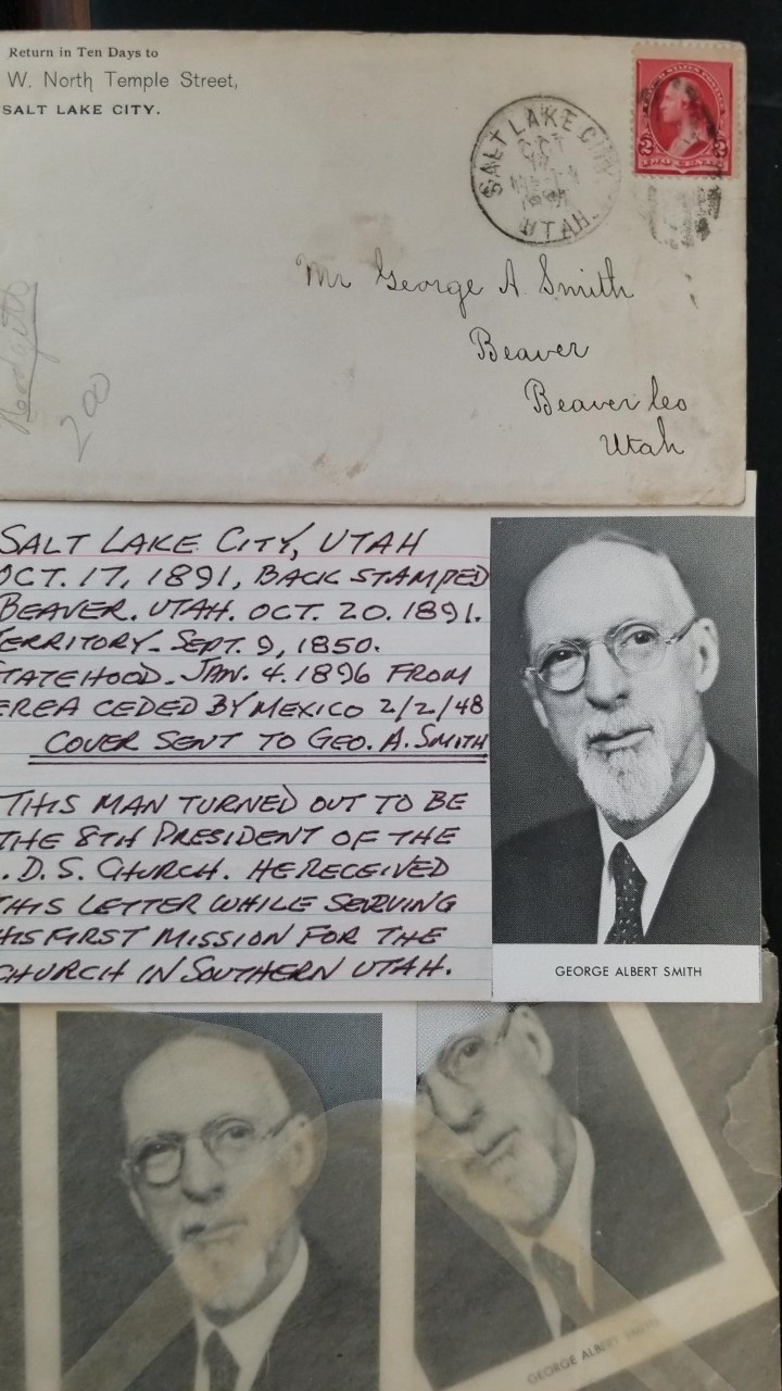 Envelope only; no letter inside. Scribbling on the back of the envelope. Someone put a card with it, with information about Mormon Church President George Albert Smith, and a couple of small cards of his picture.