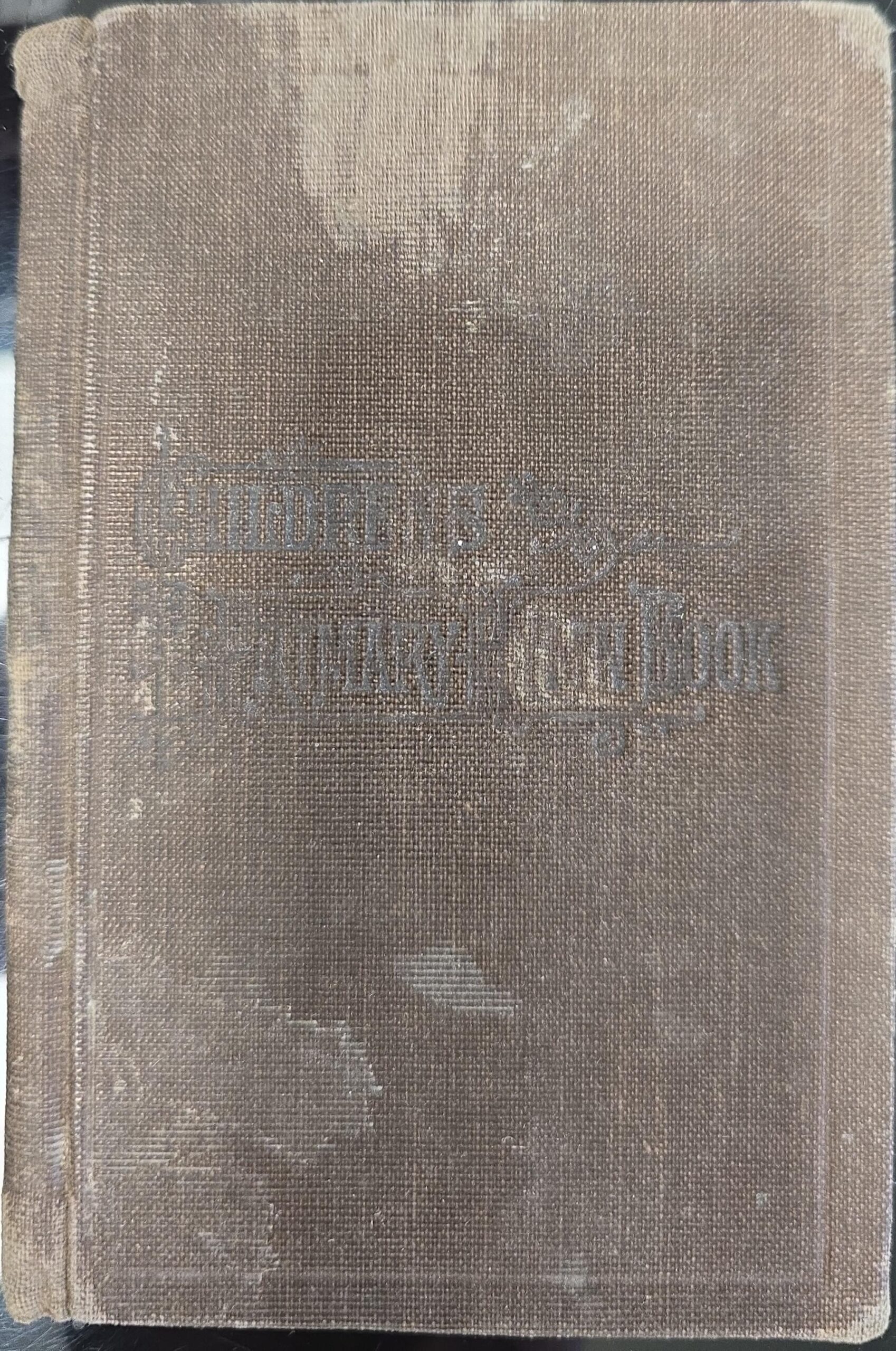 Again, the book is extremely rare in any condition. Very small; only 5 inches tall; hardcover. The cover is worn and somewhat stained; there’s an inscription inside the front cover in pencil.