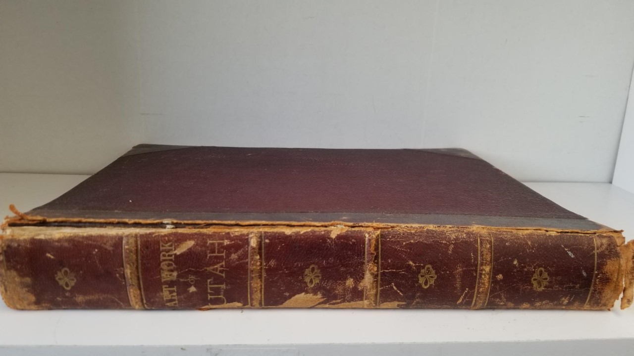 1896. Art Work of Utah. W. H. Parish Publishing Co., Chicago, Published in Twelve Parts. Huge hardbound volume; 3/4 brown leather. pages not numbered; huge heavy volume; some wear to spine and boards, but not bad at all for it’s age. Very scarce; nice huge black and white photographs throughout; front board is barely holding on. Very scarce! Very nice photographs and large size ones!