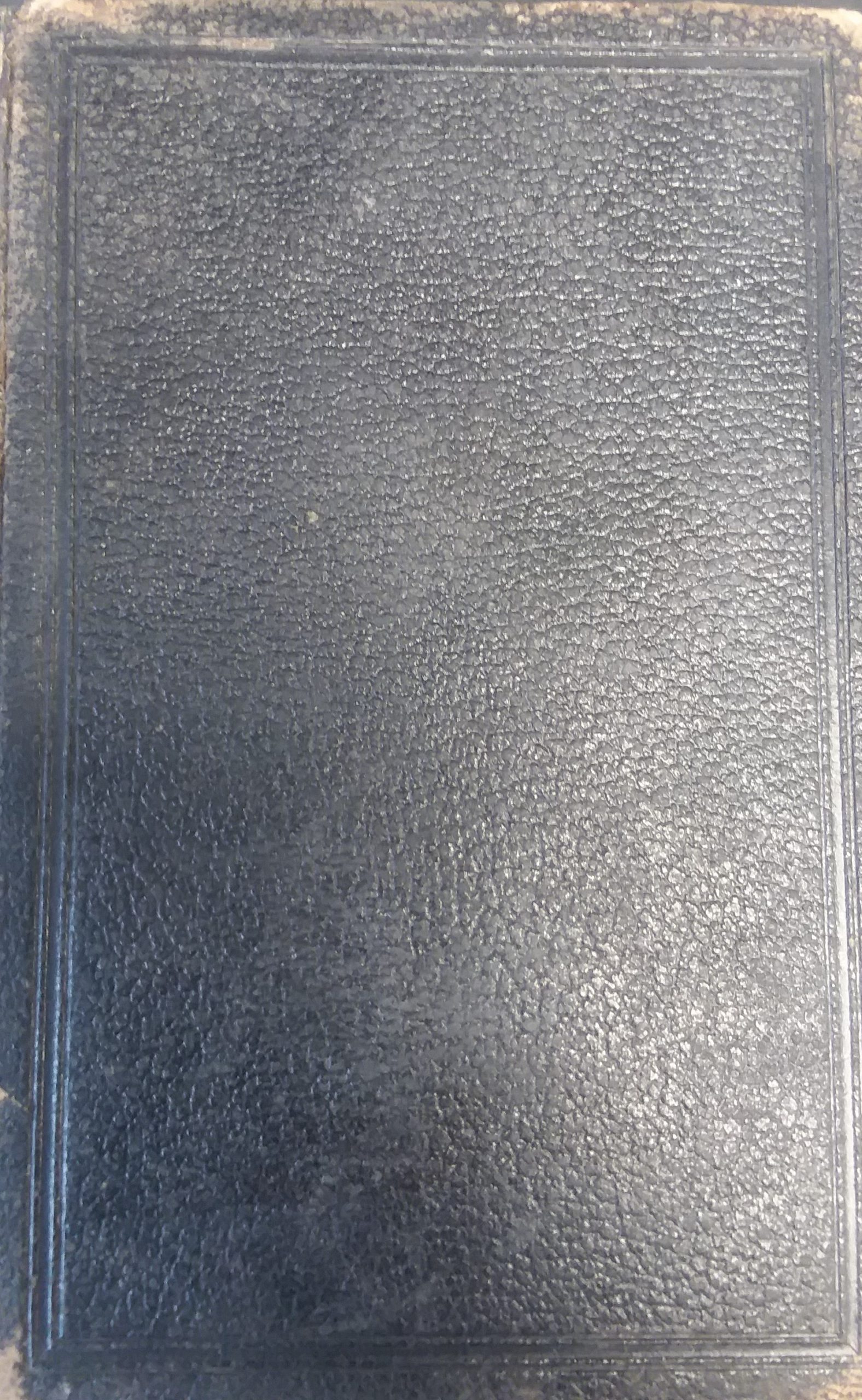 Black hardcover with faded gold lettering on the spine. Shelf wear and minor tears and flaking on the spine and both covers. Some pencil markings on the flyleaf and ink on the inner front cover, but otherwise the text throughout is clean, clear, and legible. Some stains on the sides of the pages. In fair condition.
