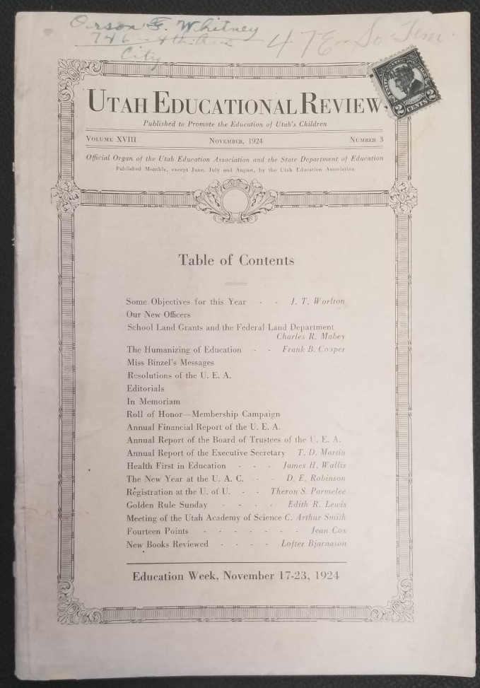 1924 — Utah Educational Review, Vol. XVIII, Number 3, November 1924 — Owned by Elder Orson F. Whitney — Single Issue Magazine