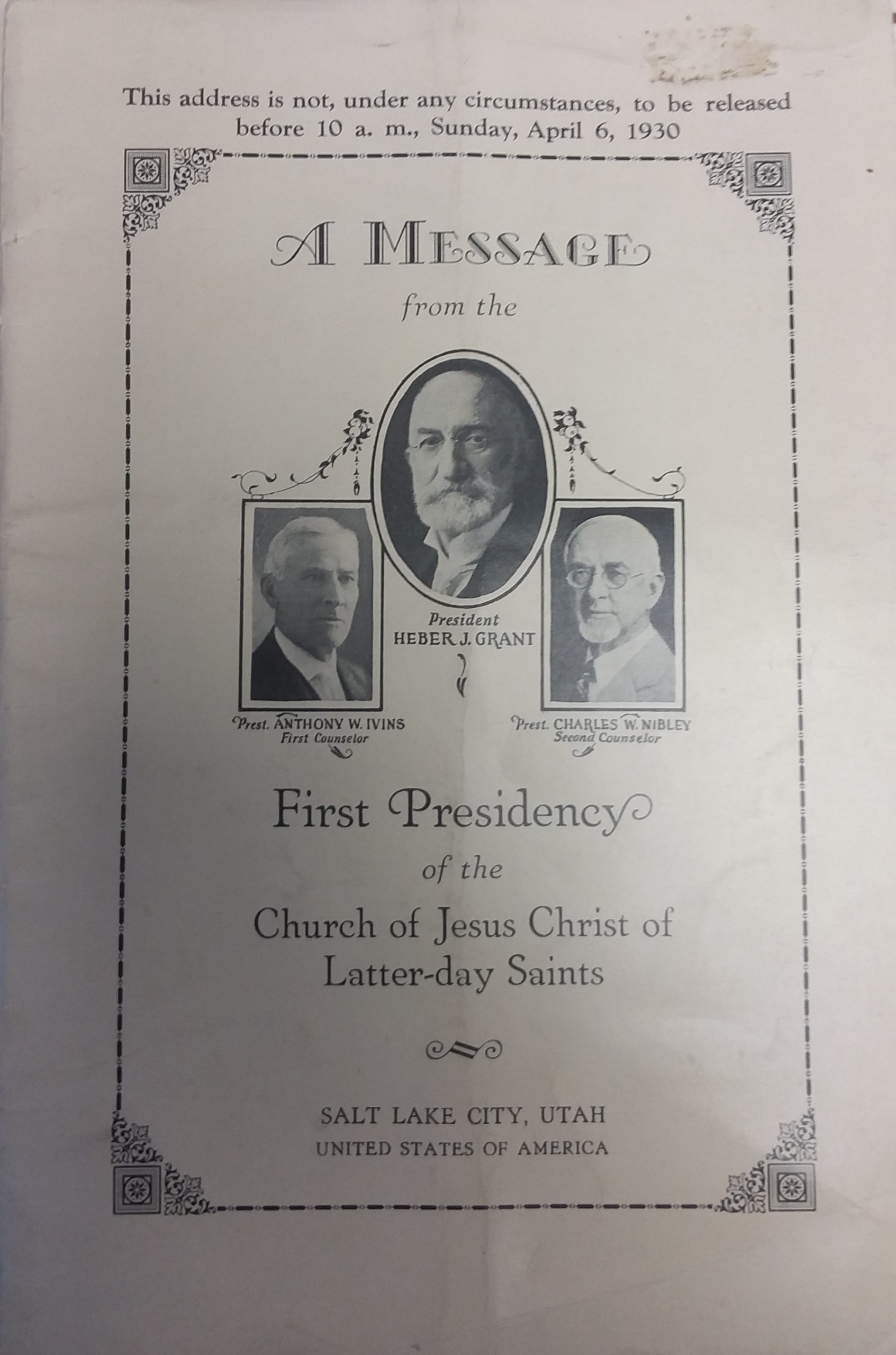 1930 – A Message From the First Presidency of the Church of Jesus Christ of Latter-Day Saints