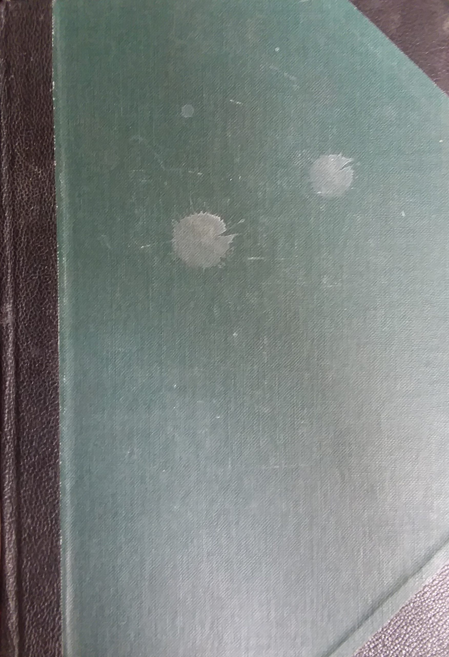 Green and black hardcover with gold lettering on the spine. Some minor shelf wear with scuffs and smudges on both covers. Some water damage on the front cover. The binding is broken. Stamp and pencil markings on the flyleaf, but otherwise the text throughout is clean, clear, and legible. The first few pages are town. White stains on the front cover.