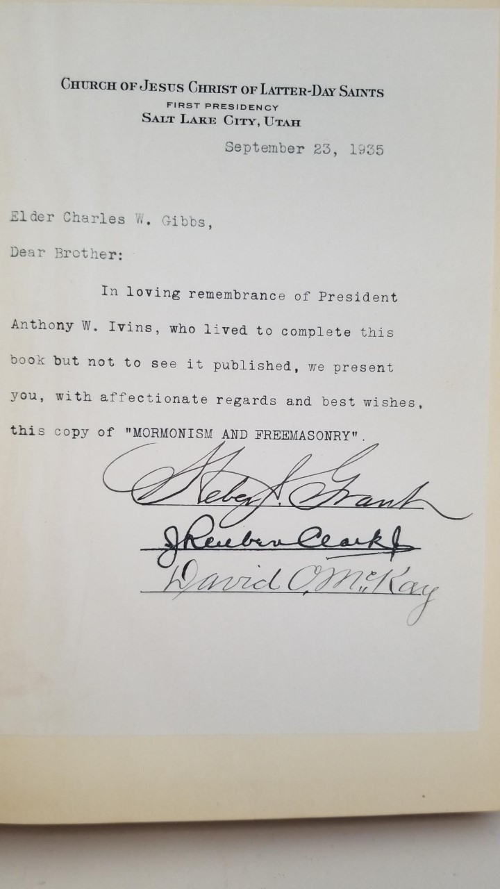 1934 — The Relationship of Mormonism and Freemasonry — Anthony W. Ivins — Signed by Pres. Heber J. Grant & Pres. David O. McKay!