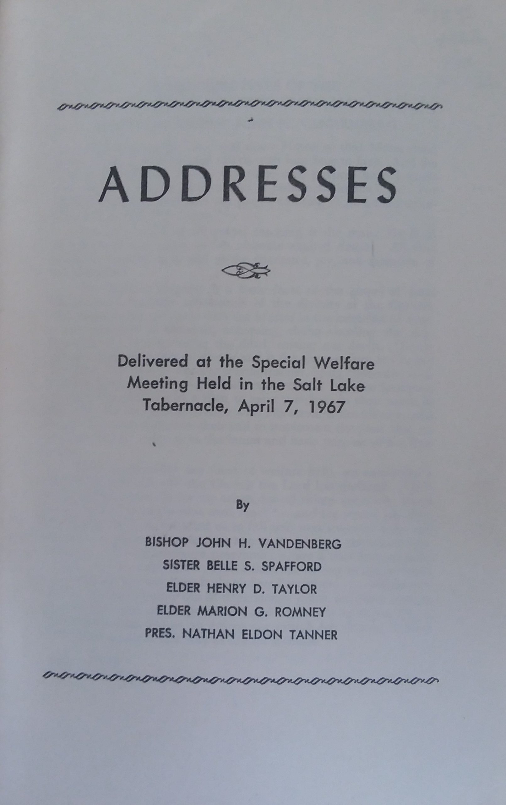 1967 – Addresses: Delivered at the Special Welfare Meeting Held in the Salt Lake Tabernacle – Numerous Authors