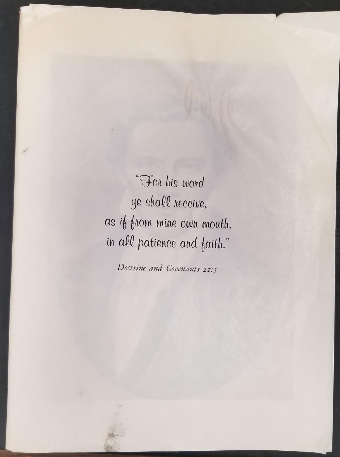 28-Page Softbound Booklet; front cover is a somewhat transparent thin sheet that you can see thru, and see the image of Joseph Smith behind it on the next page.