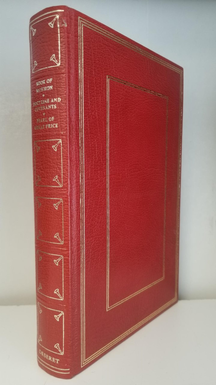 Red leather binding; gold leafed page edges; ribbon bookmark. Red end sheets.