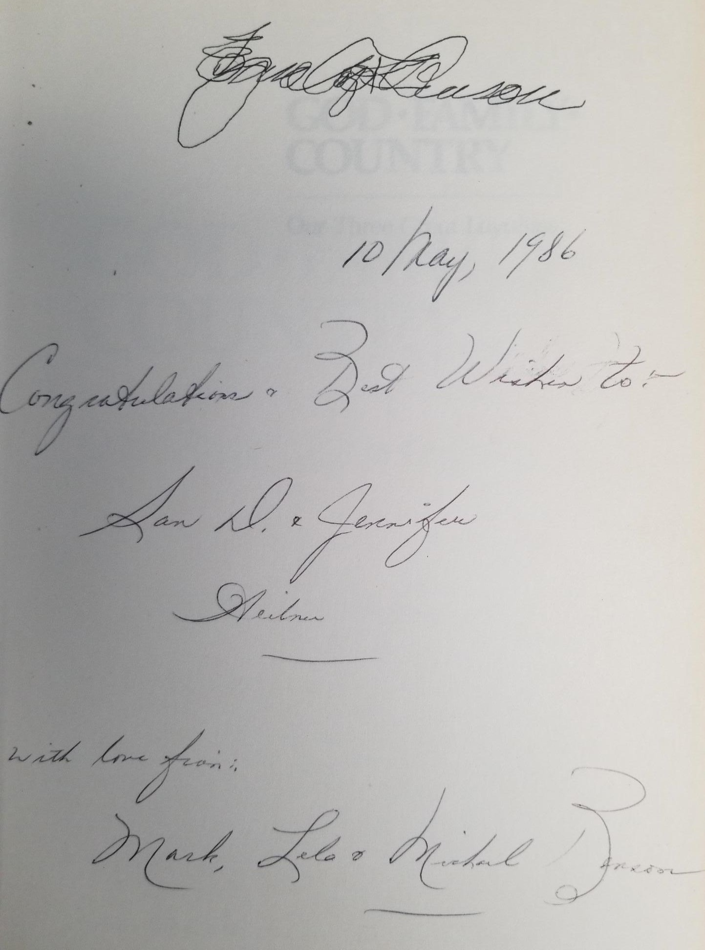 1975 — Book Signed by President Ezra Taft Benson — Gift Inscription From Mark Benson (Pres. Benson’s Son) — God, Family, Country – Our Three Greatest Loyalties