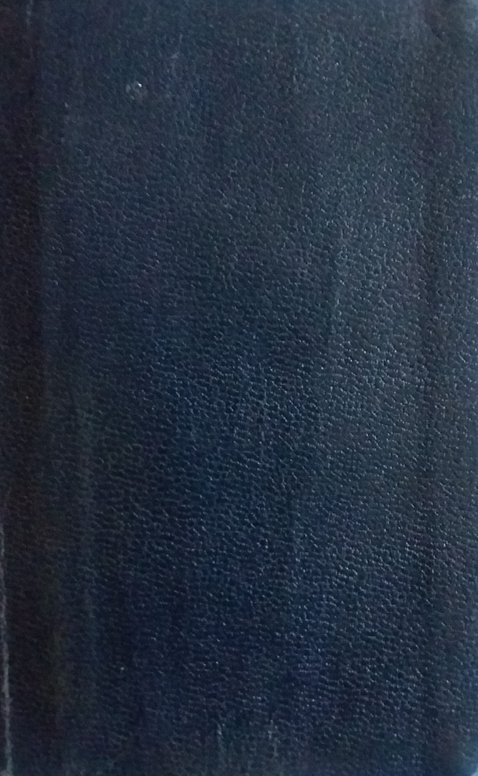 Miniature black leather softcover with silver lettering on the spine. Some shelf wear with scuffs on both covers and a large fold on the back cover. The title page has been partially ripped out. Pencil markings and pencil highlight in some sections of the text, but otherwise the text is still clear and legible. Some pen markings on the inside of the back cover. In fair condition.