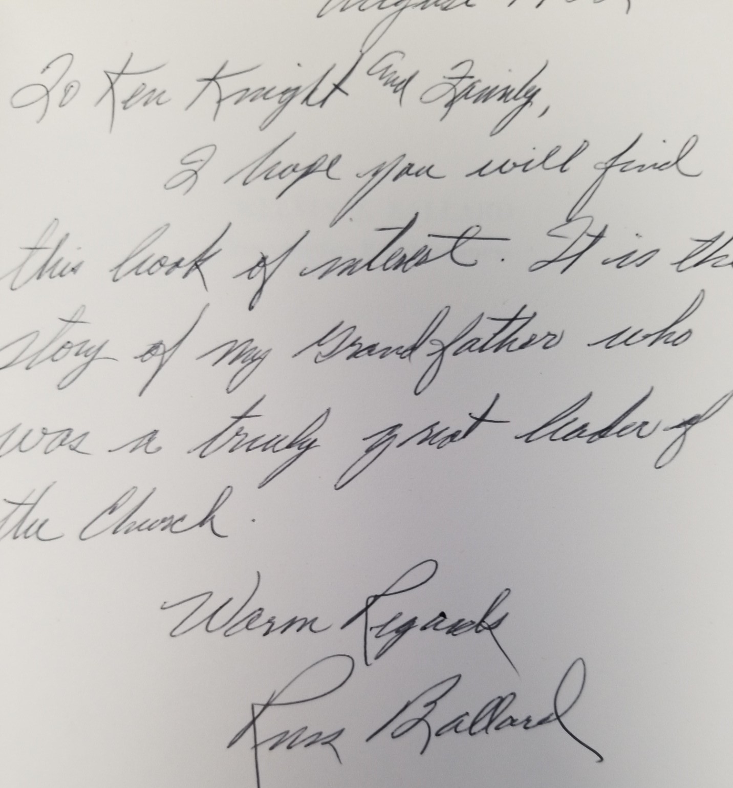 Lengthy inscription by M. Russell Ballard and quite personalized when he signed as “Russ Ballard.”