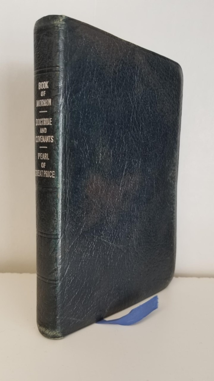 Leather Binding, as pictured; looks almost black but up close you can tell it was a deep blue; binding is a bit splotchy-looking like it wore or faded differently in places.