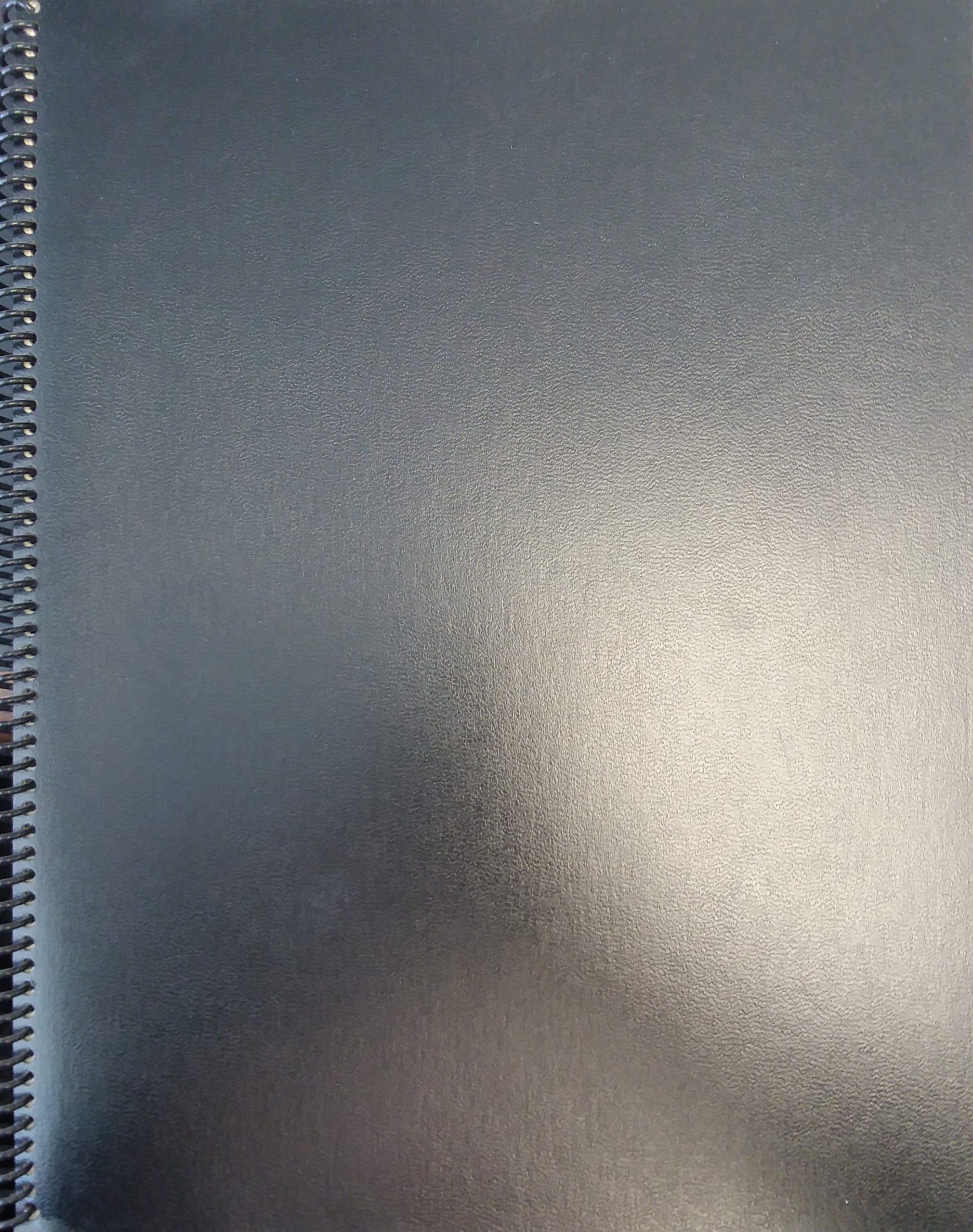 Tall, thin, spiral-bound black softcover. Pencil markings on the flyleaf, but otherwise the text throughout is clean, clear, and legible. In good condition.
