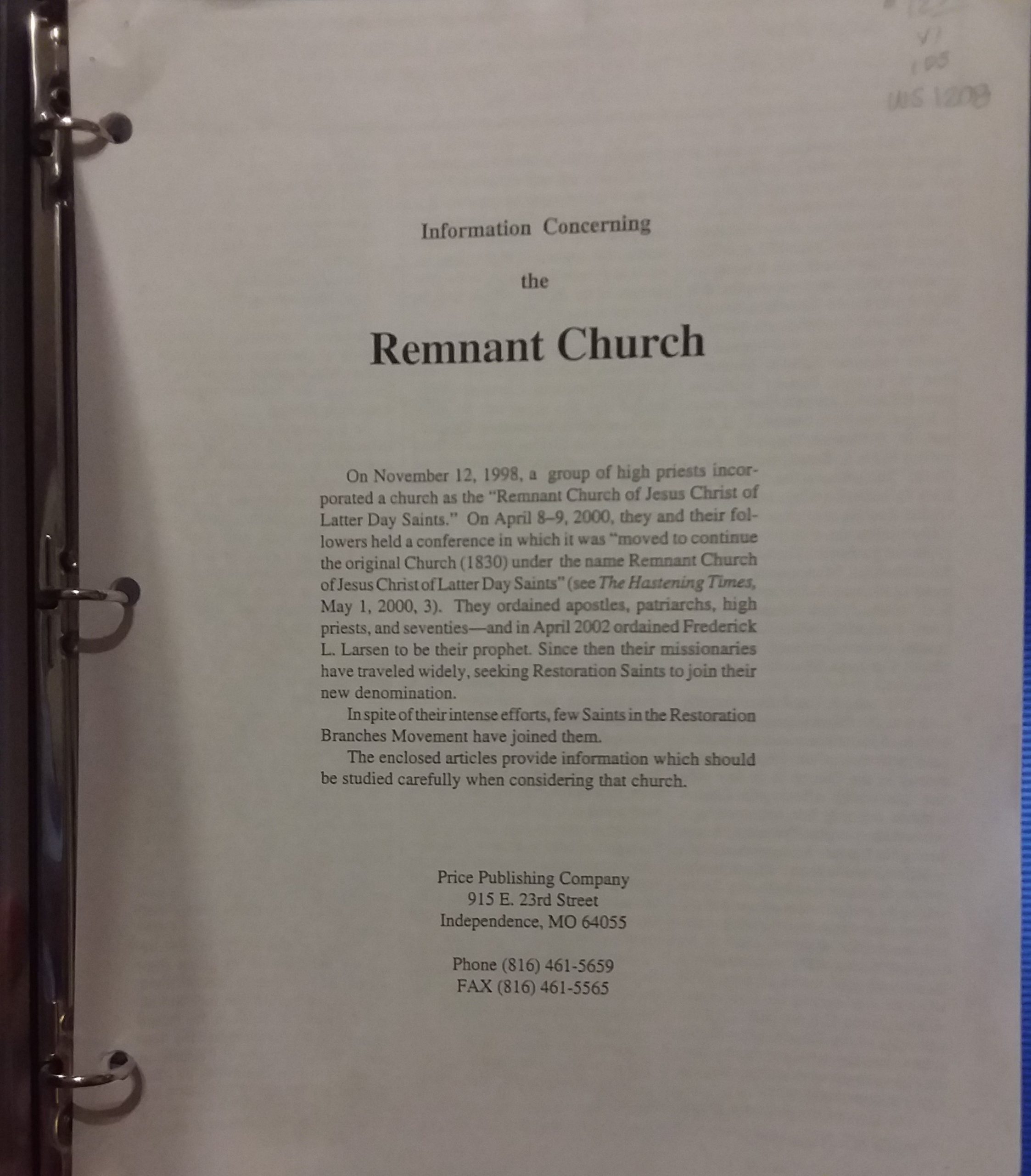 1999 – Information Concerning the Remnant Church – Remnant Church of Jesus Christ of Latter-Day Saints