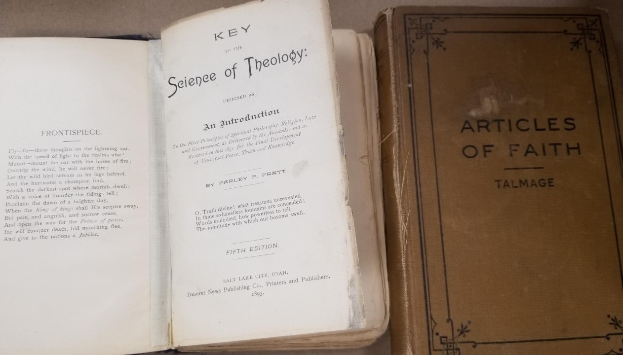 Both books are very worn. The Articles of Faith volume is still in fair condition, but the KEY TO THE SCIENCE OF THEOLOGY is worn, broken, taped up, and has missing pages!
