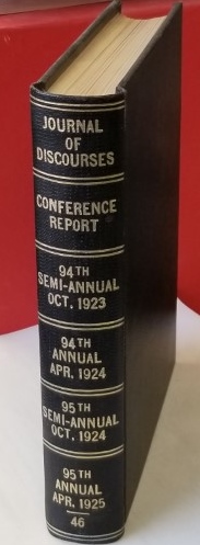 Black hardcover; someone had these four Conference Reports bound together. It includes October 1923, April 1924, October 1924, and April 1925. At the top of the spine they put Journal of Discourses and at the bottom of the spine they put the number 46.