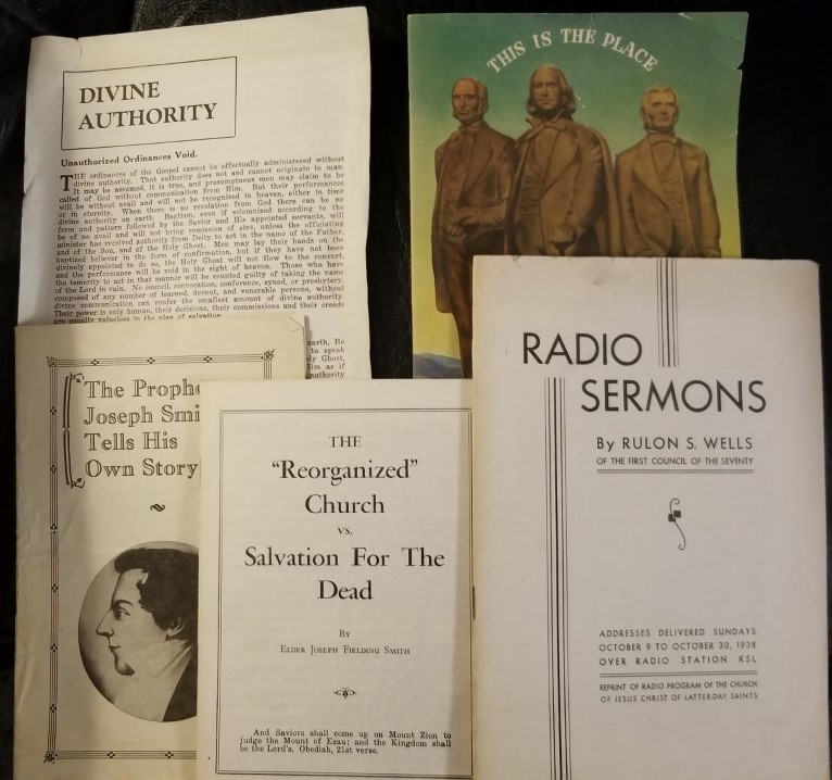 / 5 LDS Pamphlets — Reorganized Church vs Salvation for the Dead / Joseph Tells His Own Story / Divine Authority / Radio Sermons / Utah Centennial