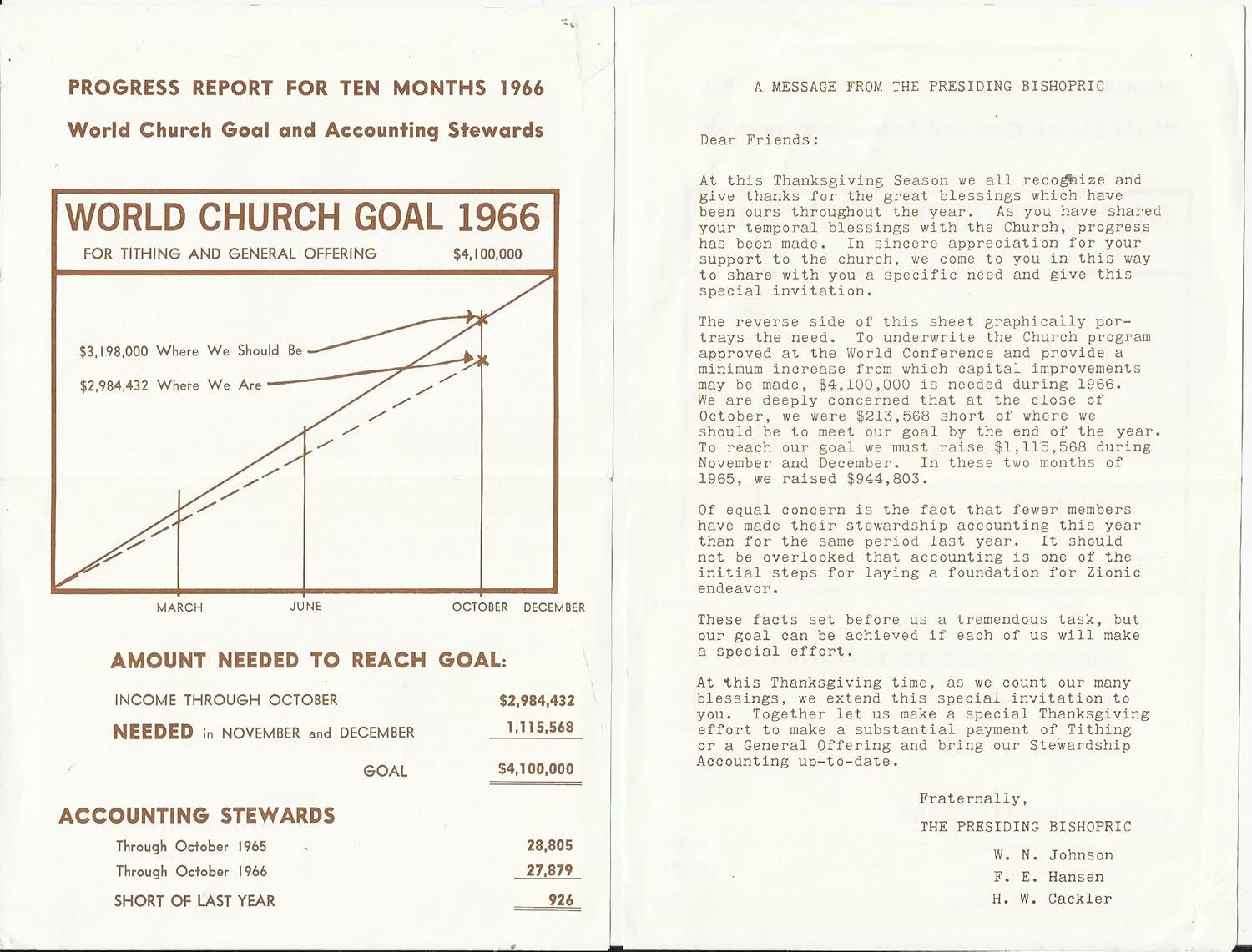 A Message From the Presiding Bishopric — Progress Report for Ten Months 1966 / World Church Goal and Accounting Stewards — 2 Sided