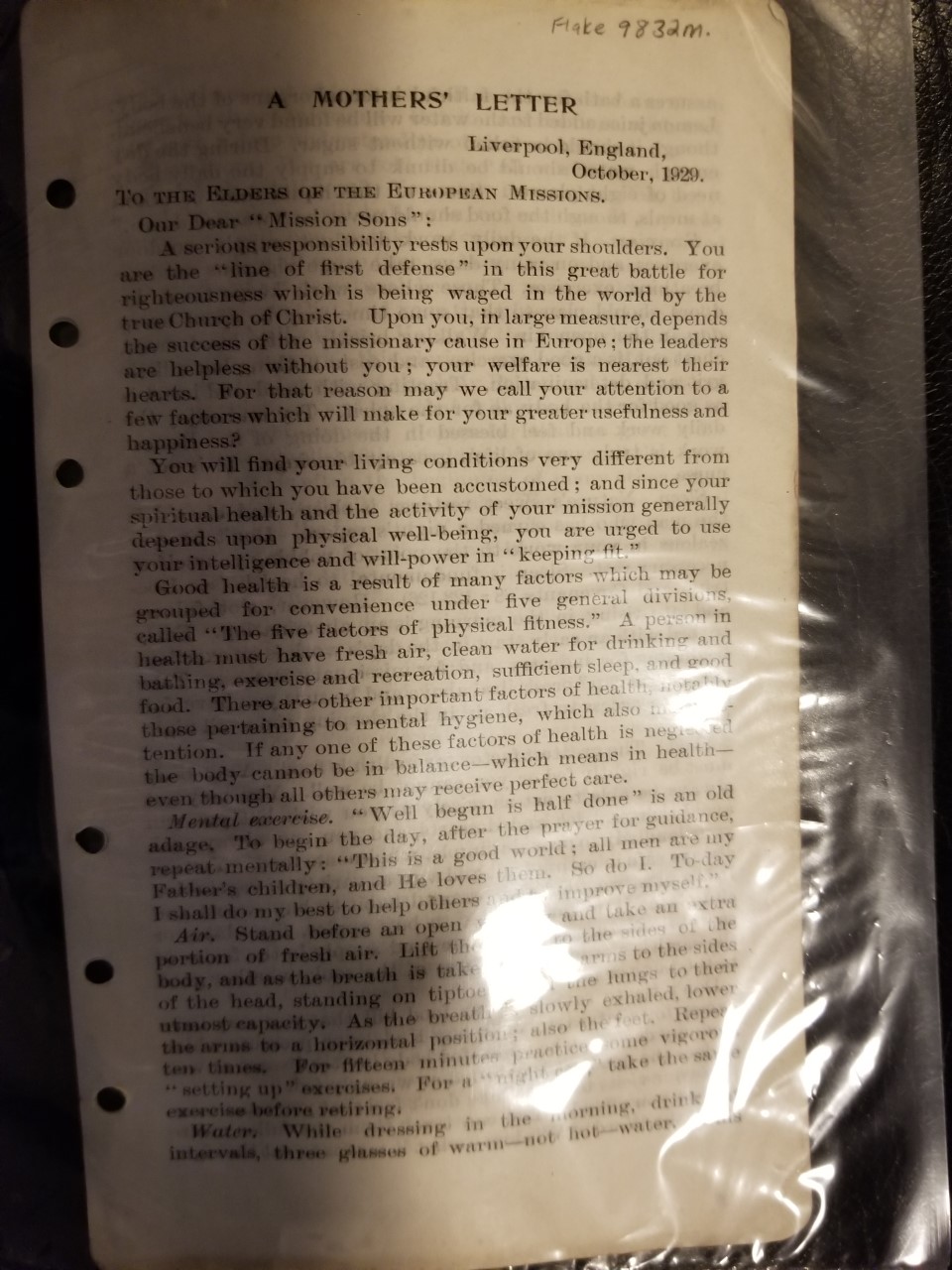 A Mother’s Letter, Liverpool, England, October, 1929, To The Elders of the European Mission . . .
