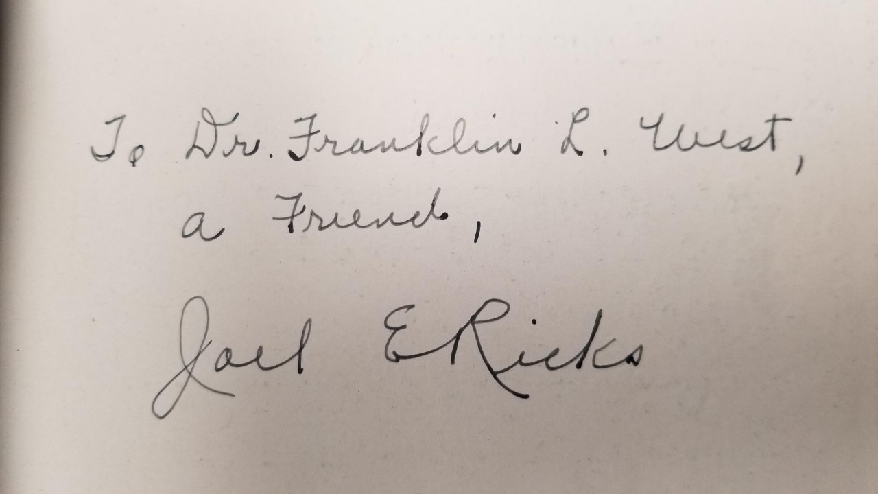 Book Inscribed to Dr. Franklin L. West (author) by Joel E. Ricks (author) — A History of Fifty Years – Utah State Agricultural College