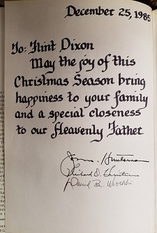 Nice full page gift inscription; looks like perhaps when Jon Huntsman Jr. was bishop; as it is also signed by two others (most likely his counselors.)