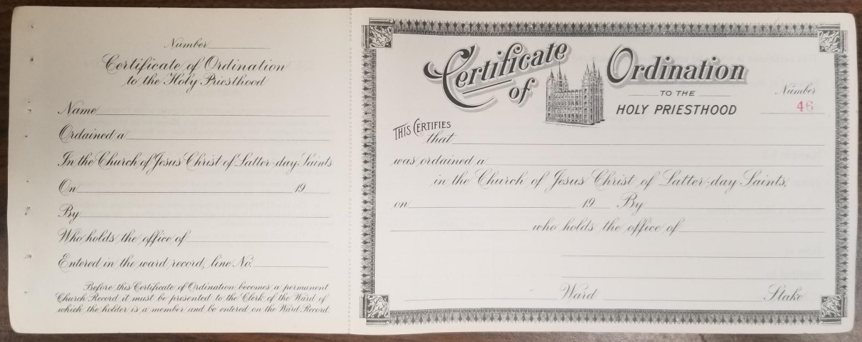 “Certificate of Ordination To The Holy Priesthood” — Unused Certificate Used in the 1900s