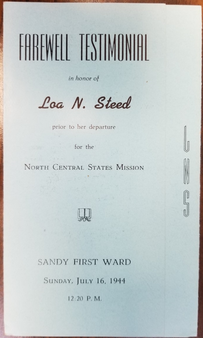 Farewell Testimonial in honor of Loa N. Steed prior to her departure for the North Central States Mission…Sandy First Ward, Sunday: July 16, 1944, 12:20 P.M.