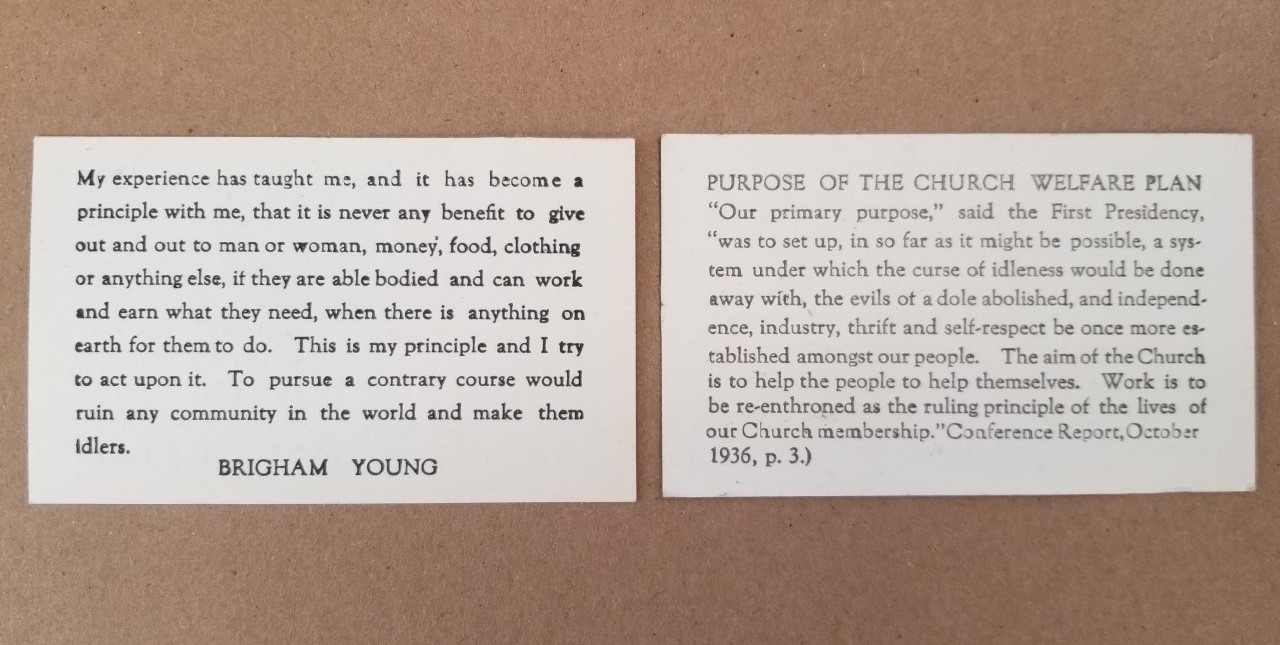 / LDS Card: 2.5″ x 4″ — Brigham Young Quote / Purpose of the Church Welfare Plan