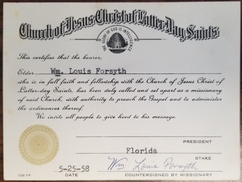 Small certificate for an LDS Missionary. Name on the certificate is Wm. Louis Forsyth and he signed it, but it doesn’t have the President’s signature on it.
