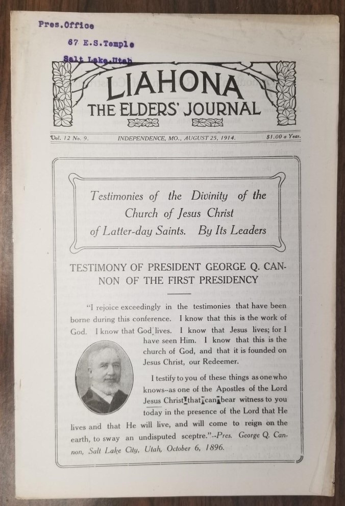 When this issue of this LDS periodical was mailed to the Beehive House, President Joseph F. Smith would have been its third occupant, since three LDS Church Presidents lived there.