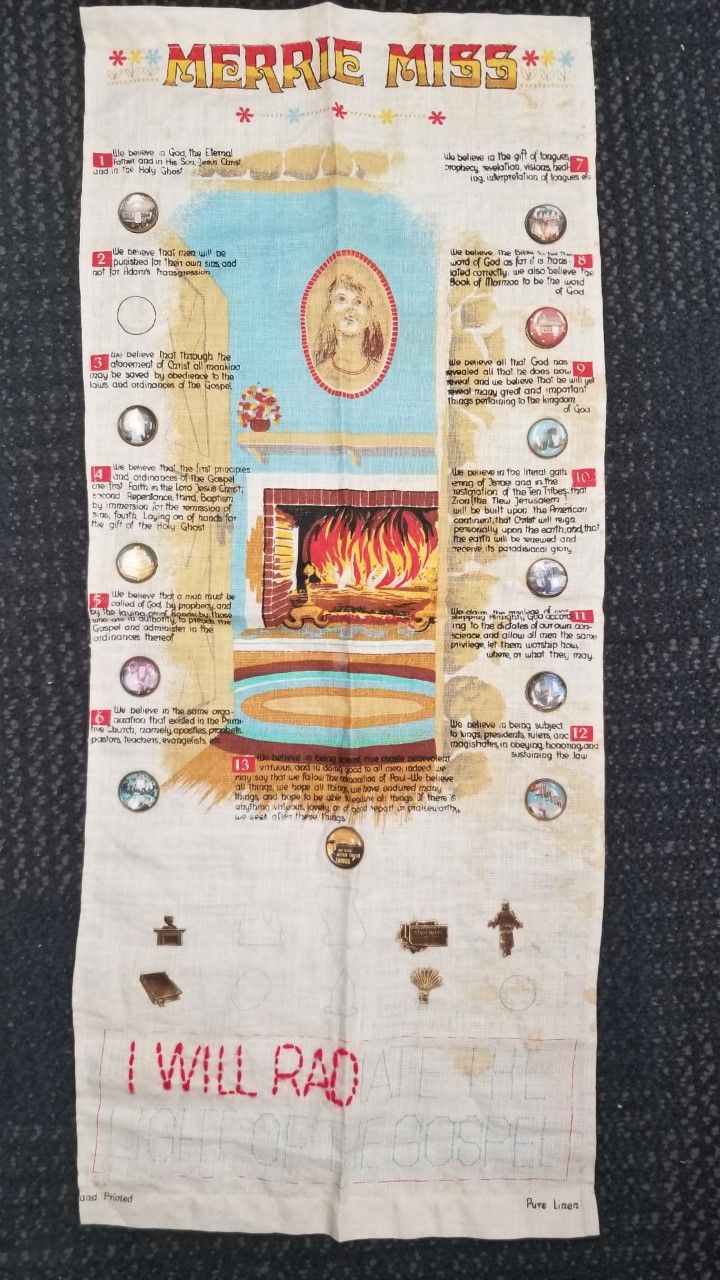 Merrie Miss Banner — With 13 Articles of Faith — With Little Round Glass Pieces — 1 Foot Wide & 2’5″ Tall