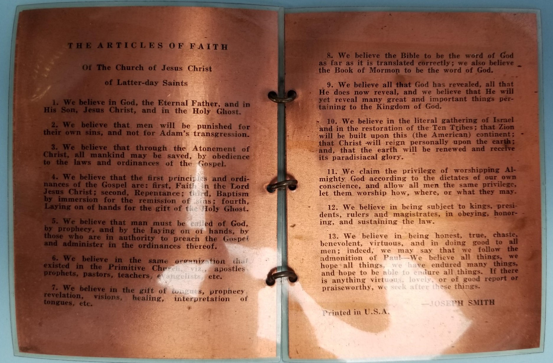 mormon mormons mormonism lds copper plate plates article of faith utah centennial