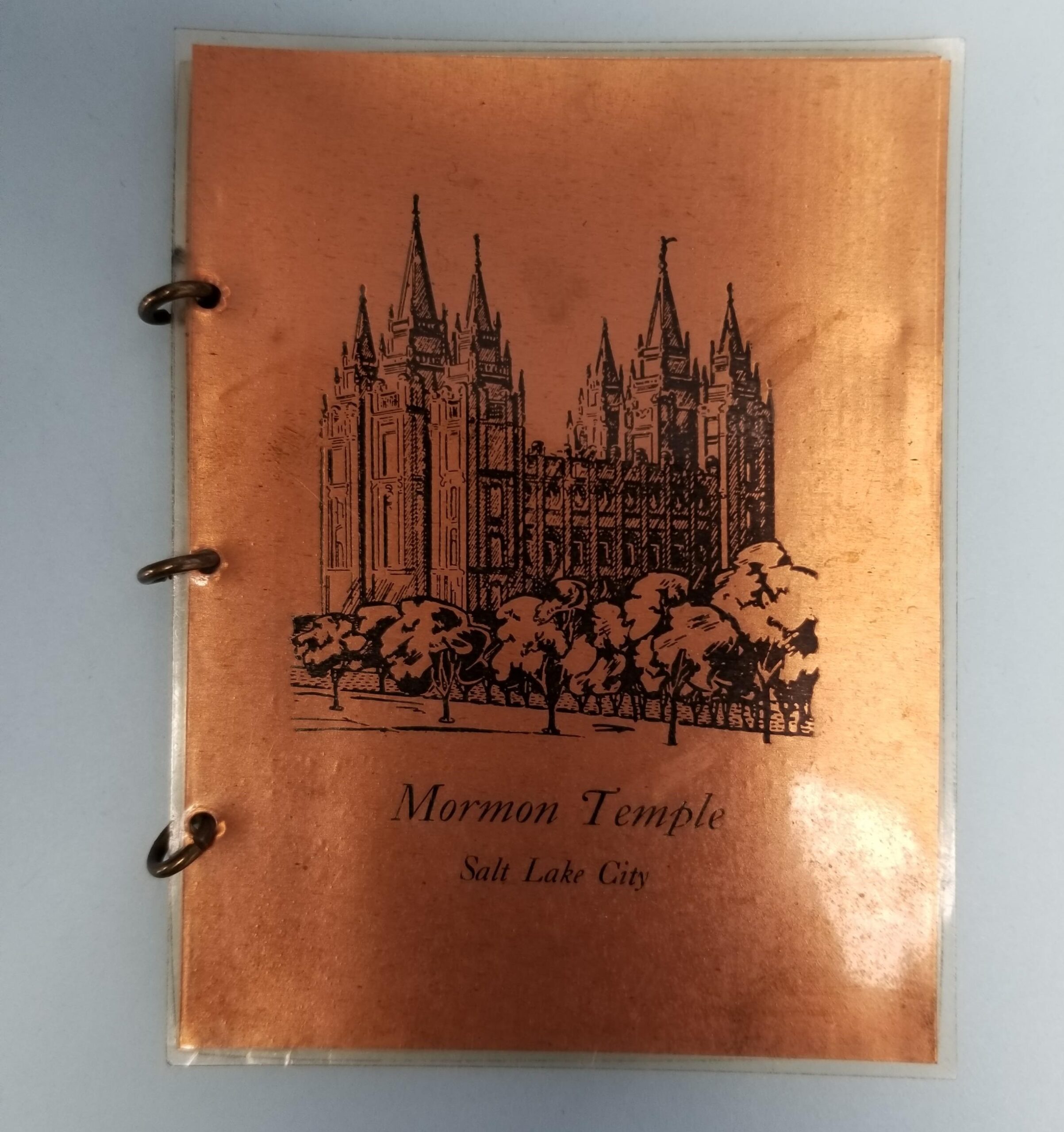 Mormon Temple – Salt Lake City —- Articles of Faith —- Utah Centennial 1847-1947 —- 2 Laminated Copper Plates with 3 Rings