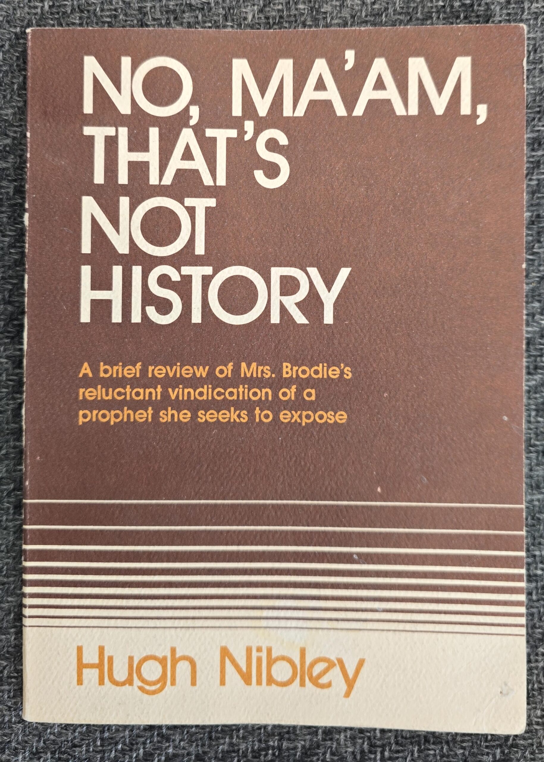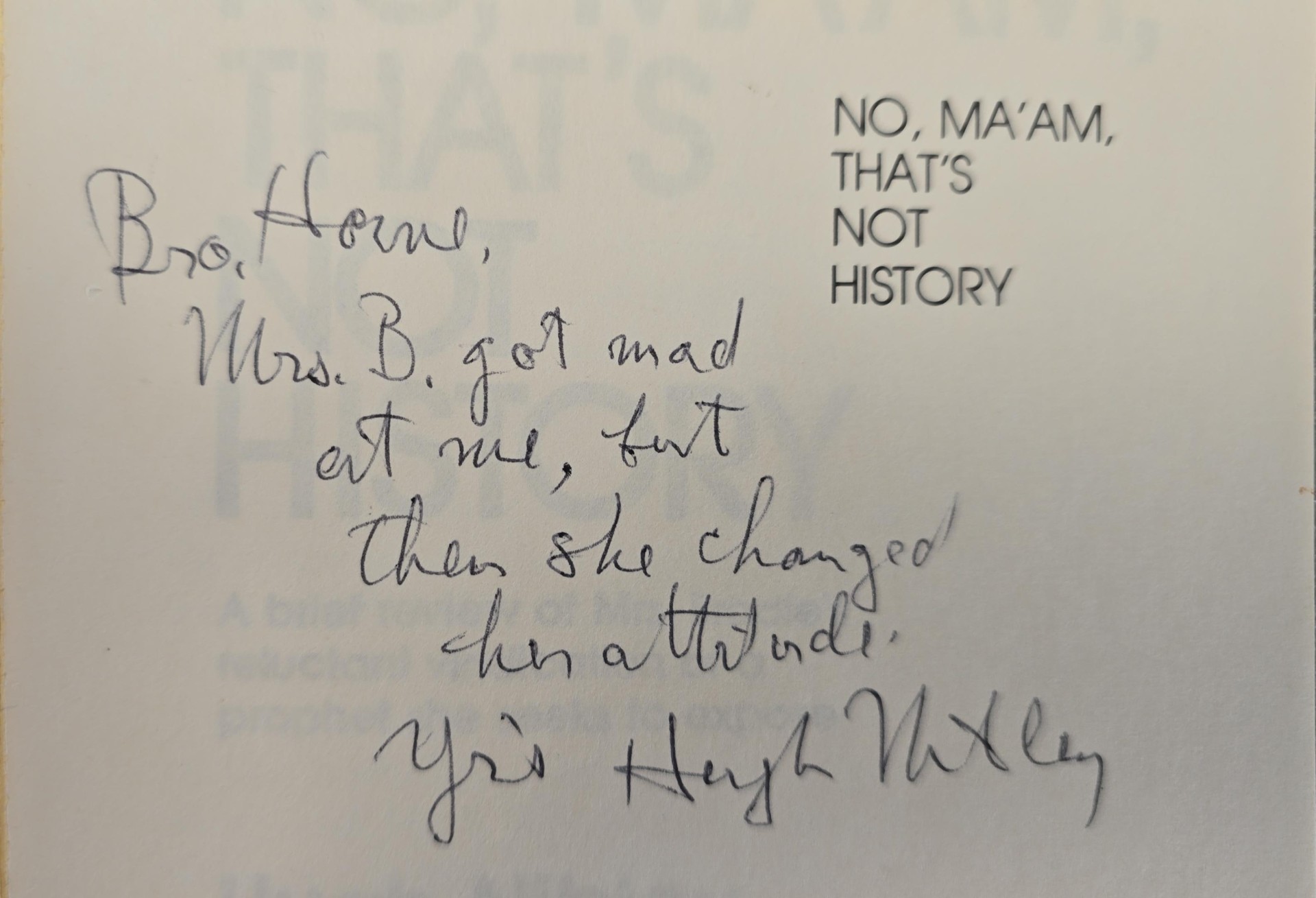 No Ma’am, That’s Not History — by Hugh Nibley — Uniquely Signed by Nibley — “Bro. Horne, Mrs. B. got mad at me, but then she changed her attitude, Yr’s Hugh Nibley”