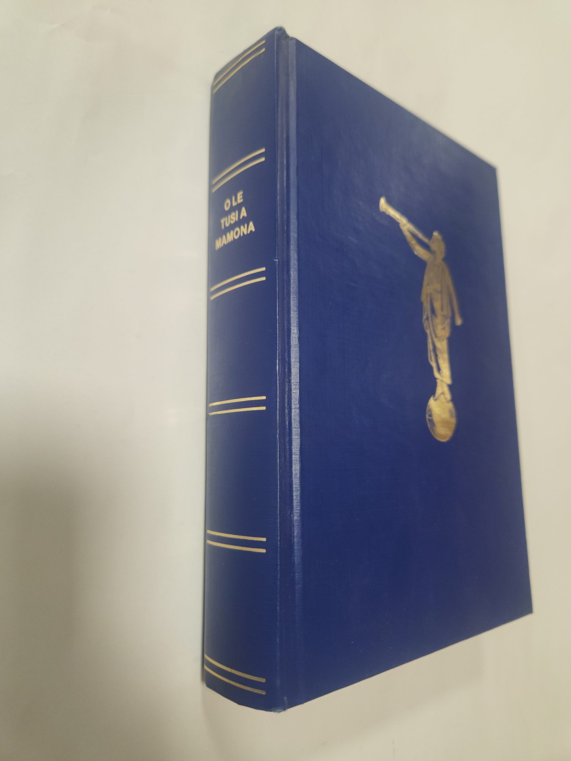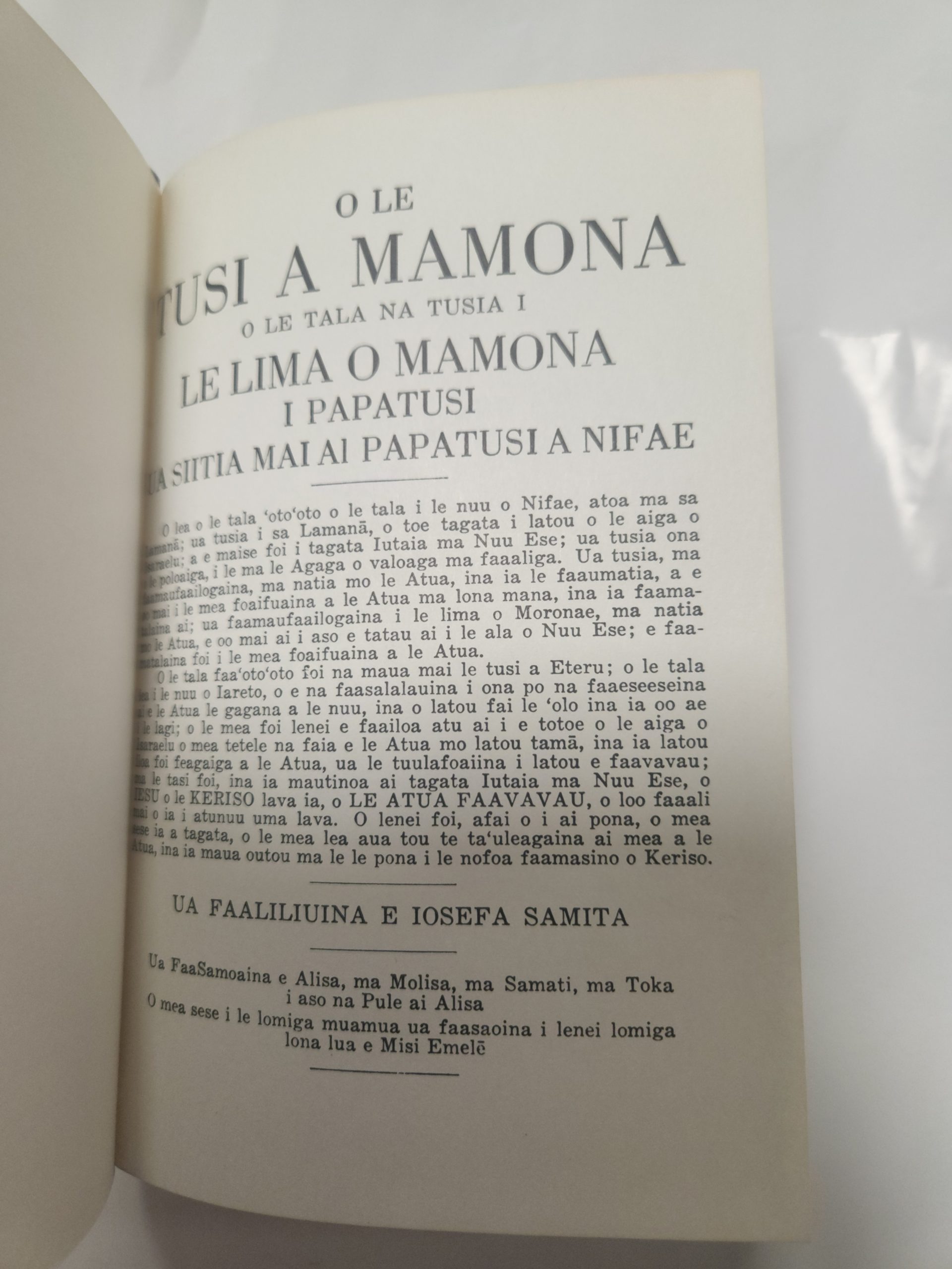 O Le Tusi A Mamona (Book of Mormon-Samoan Translation, hardcover) No markings, moderate scuffs/smudges on back cover, front cover shows minor wear, and good binding.