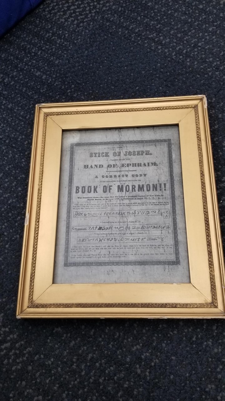 Frame is 11 inches tall; the item inside is a photocopy of an old original early advertisement about the Book of Mormon. Certainly an original would be worth a lot!