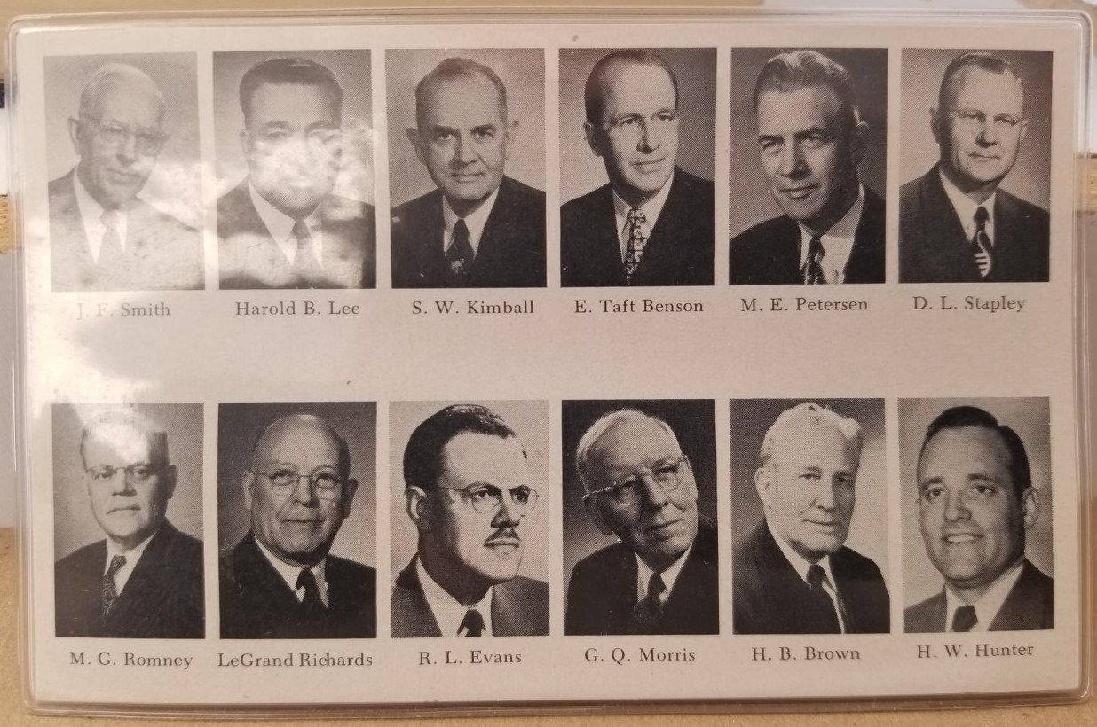 On the back you have the Quorum of the Twelve at that time: J. F. Smith, Harold B. Lee, Spencer W. Kimball, Ezra Taft Benson, Mark E. Petersen, Delbert L. Stapley, Marion G. Romney, LeGrand Richards, Richard L. Evans, George Q. Morris, Hugh B. Brown, and Howard W. Hunter.