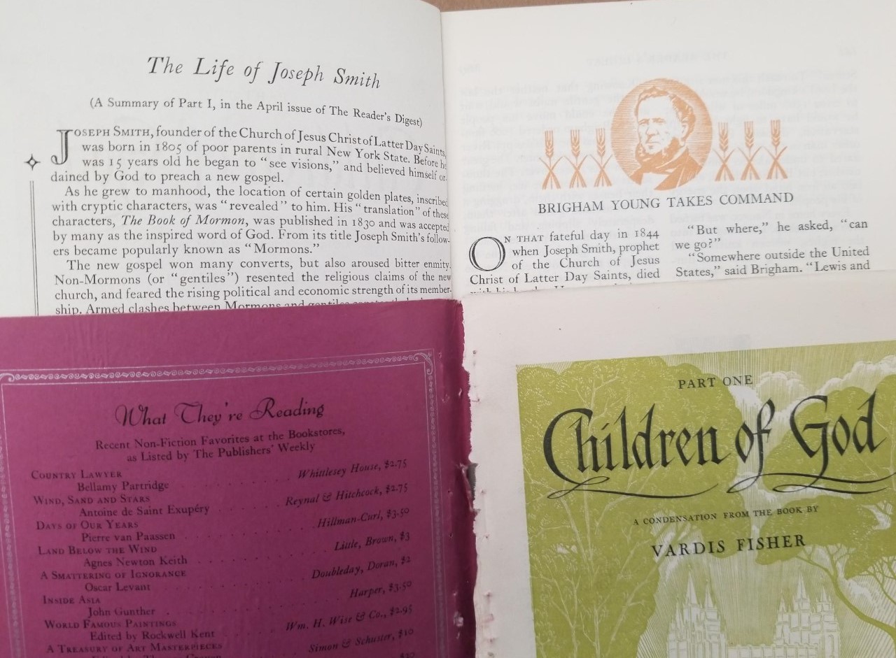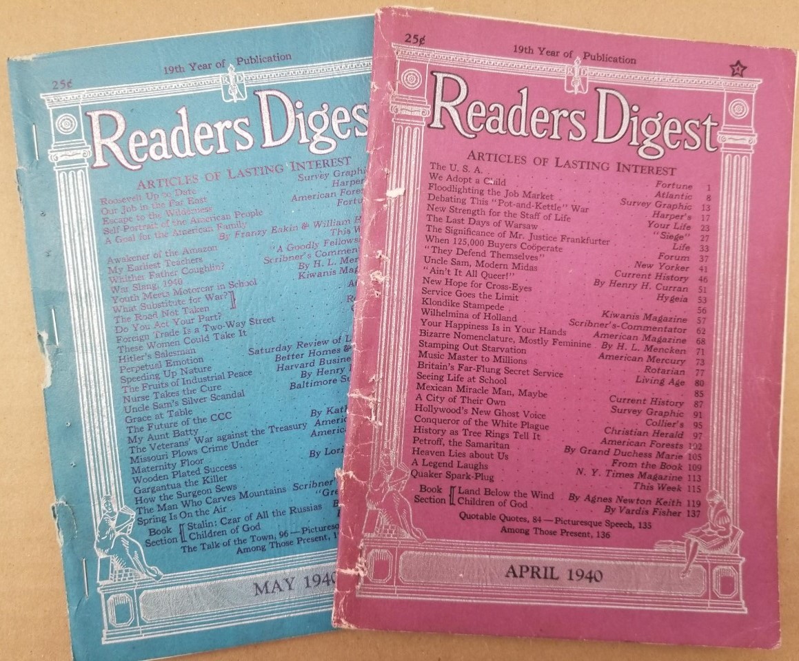 Reader’s Digest — April & May 1940 — 2 Sections with Condensed Version of “The Children of God” About the Mormons — by Vardis Fisher