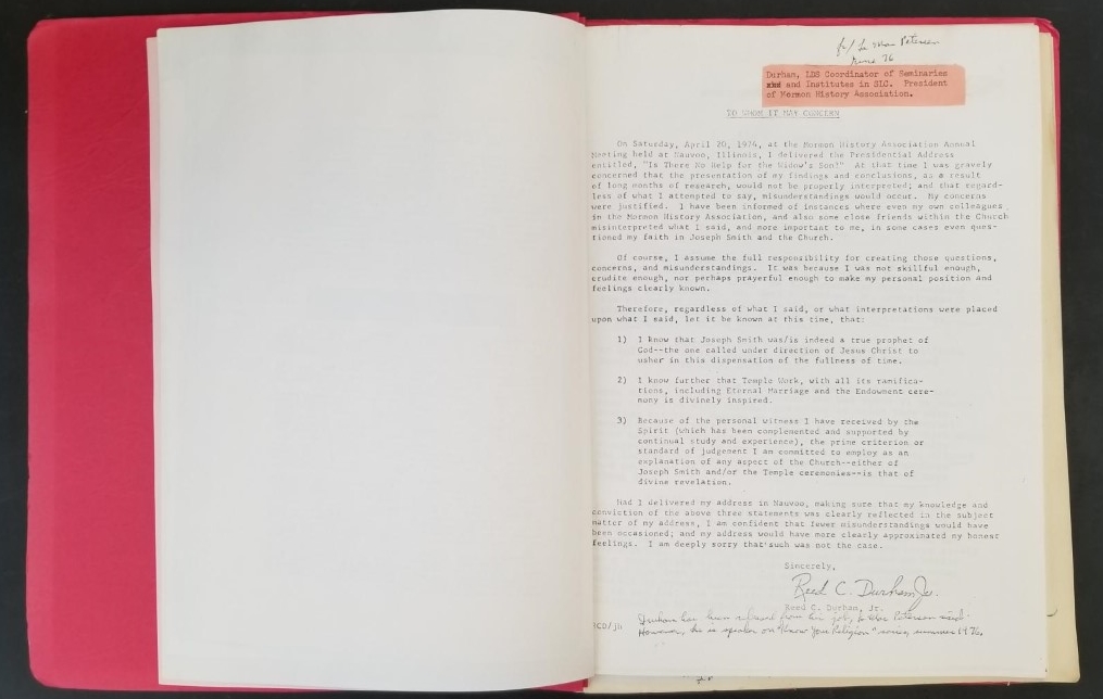 Red Folder with Documents About Reed C. Durham Jr’s Talk “Is There No Help For the Widow’s Son” and Discipline that may have taken place afterwards