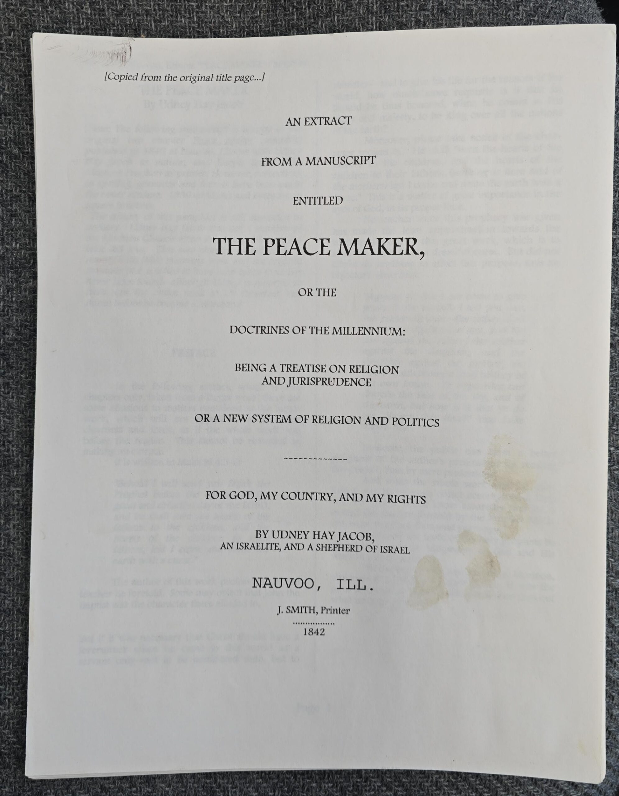 REPRINT: An Extract From A Manuscript Entitled THE PEACE MAKER, …. By Udney Hay Jacob, Nauvoo, Illinois, 1842