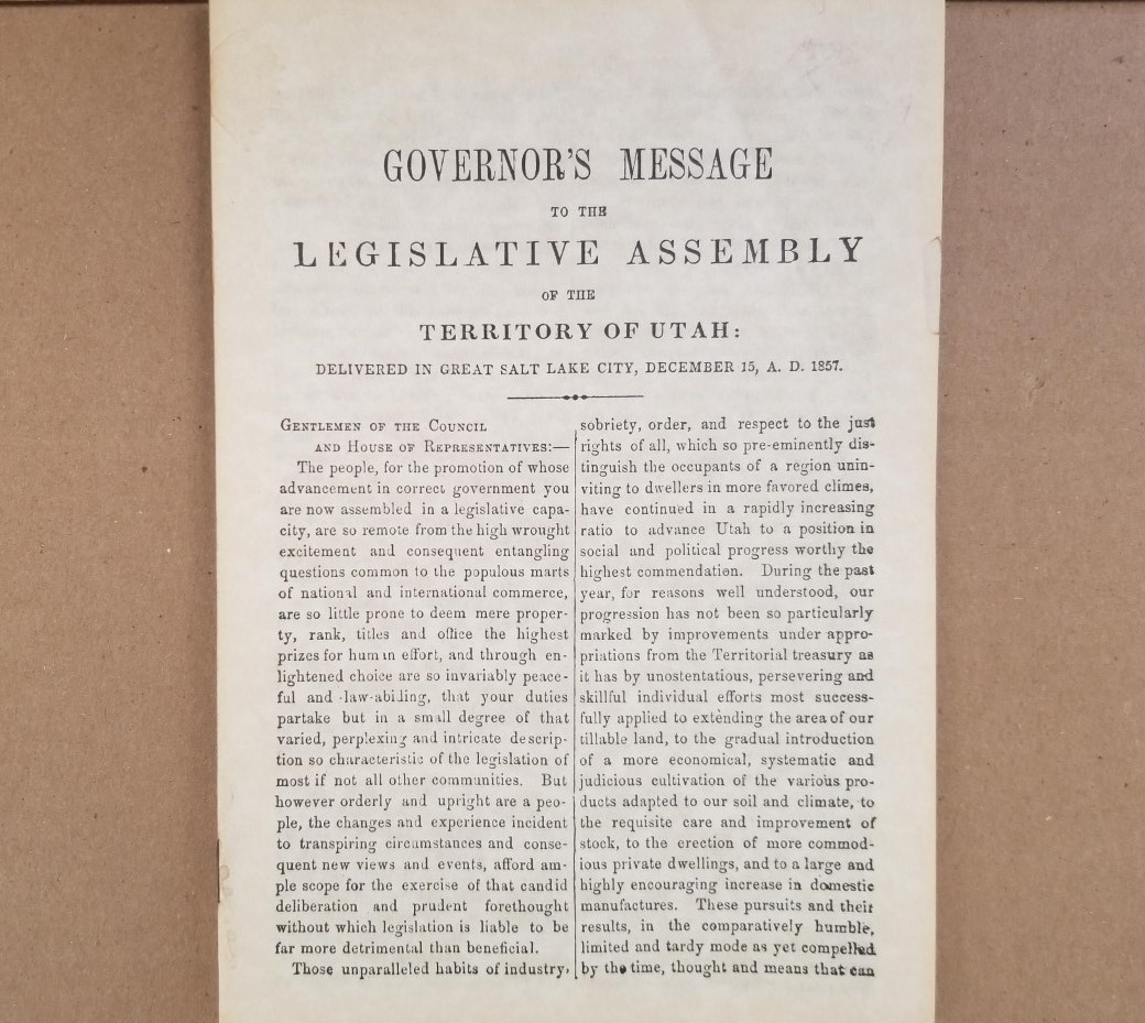 Reprint: Governor’s Message to the Legislative Assembly of the Territory of Utah Delivered in Great Salt Lake City, December 15, A.D. 1857